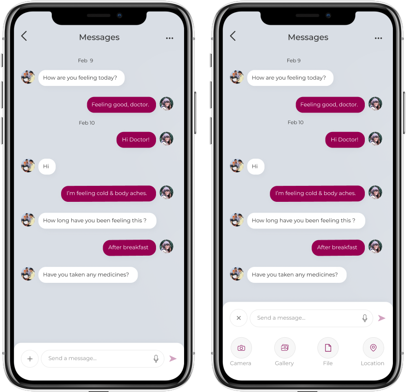 - You can send a message as text, recording, capture photo, selecting from gallery, upload a file of any media format (doc/image/video/audio) as attachment or upload a location in a message