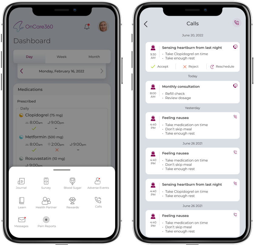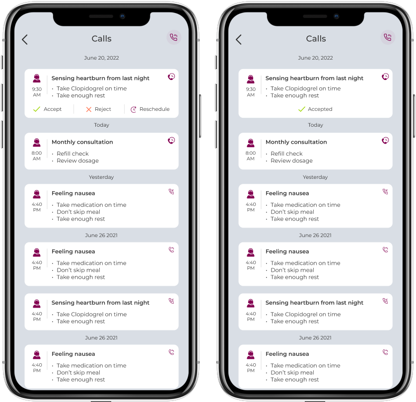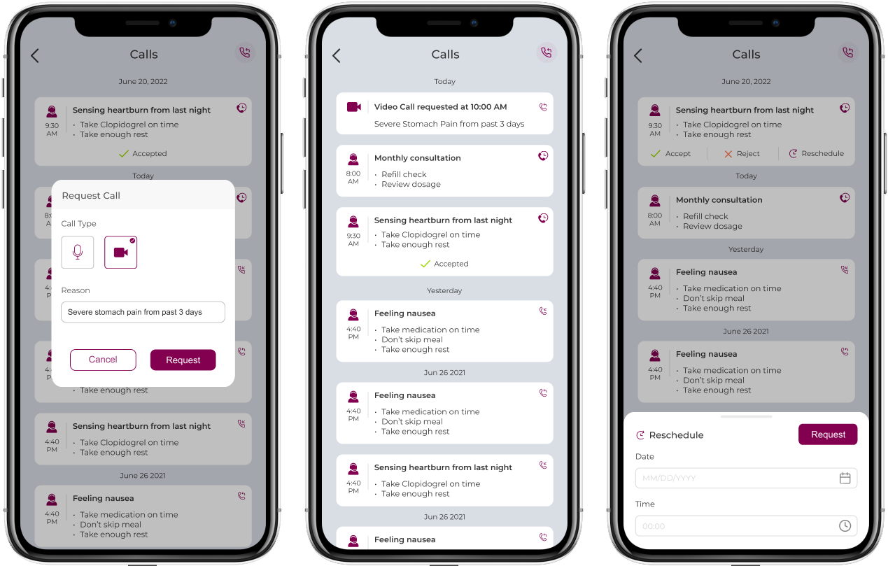Patient receives notification when a call is scheduled, Clock- ticker is activated and runs, patient will get reminder 1 day, 1 hr and 15 min before the scheduled call time.
