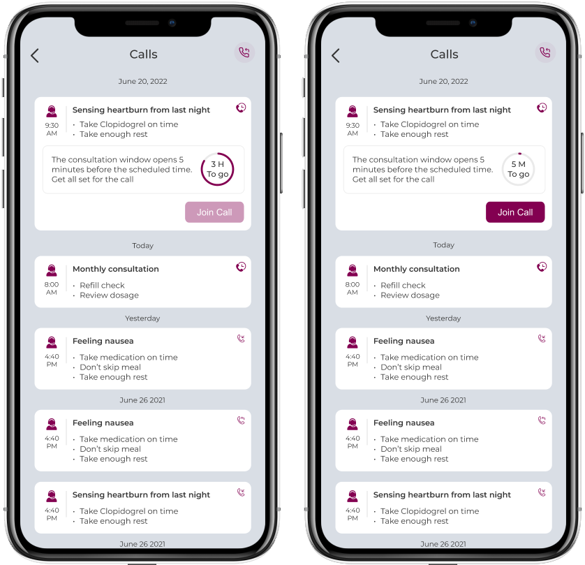 Patient receives notification when a Provider calls and Patient can join as the join call option gets enabled 5 min before the call whilst running clock-ticker.