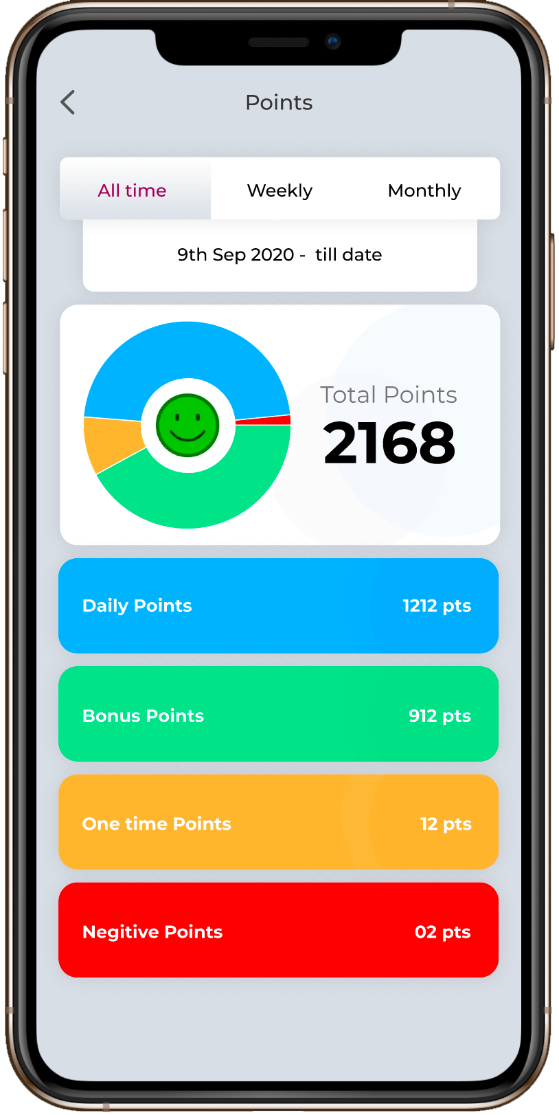 - Each timeline will have the following details- Total Points, Daily Points, Bonus Points, One Time Points and Negative Points.