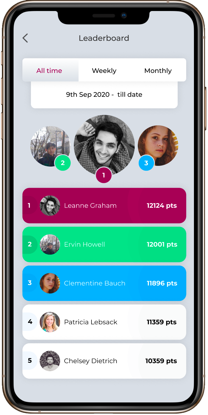 - Tapping on Leaderboard redirects to a page, where it has three timelines- All time, Weekly and Monthly, by default All time is selected.