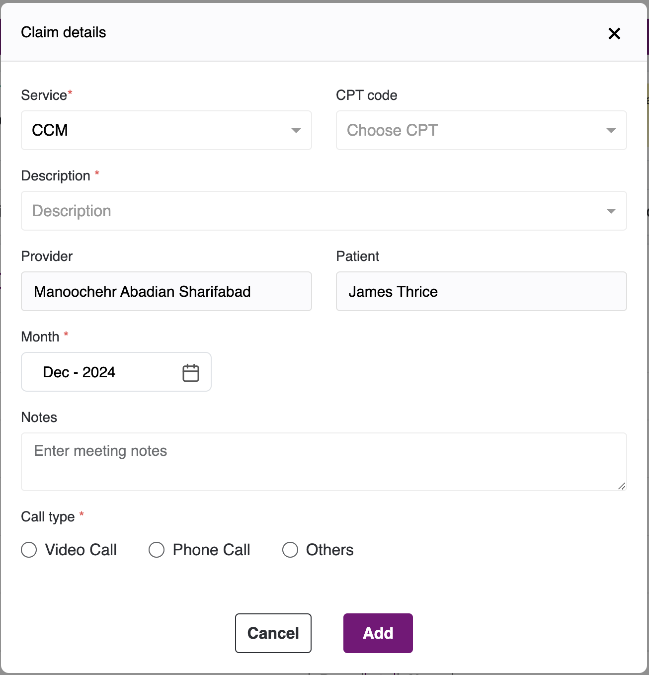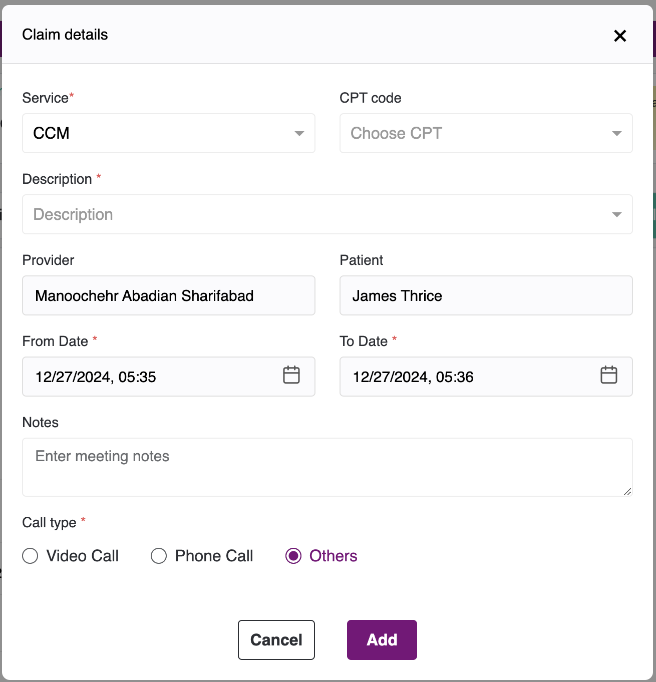 - User can use the Add Row option to add a row in the given list with entering the details like Billing Type, CPT code, topic, Provider, Patient, Date, Start Time, End time, Meeting Notes and call type.