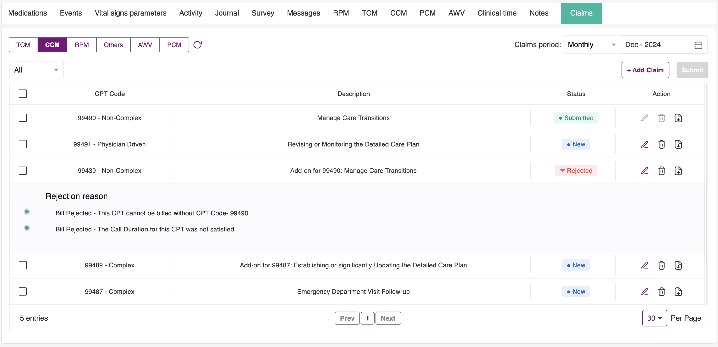 - Click on the Status filter and select Submitted Bill option and Program filter and select CCM . The following screen can be seen.