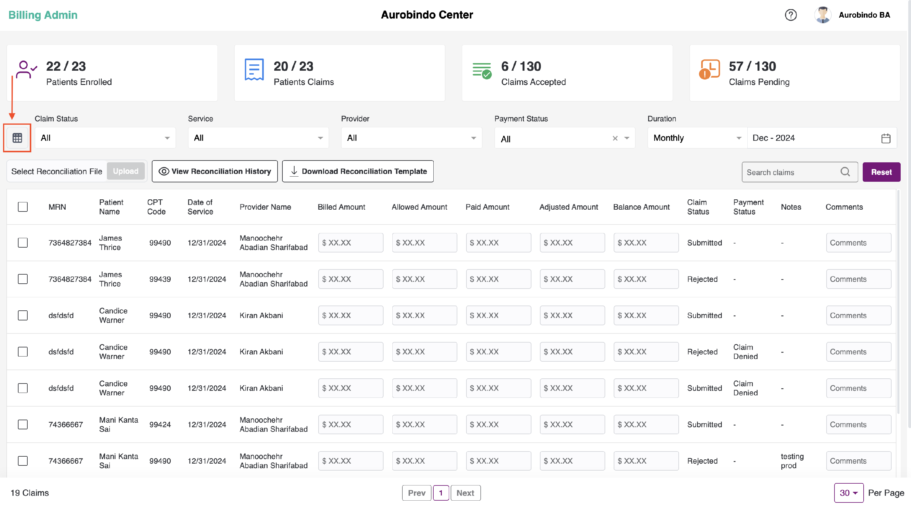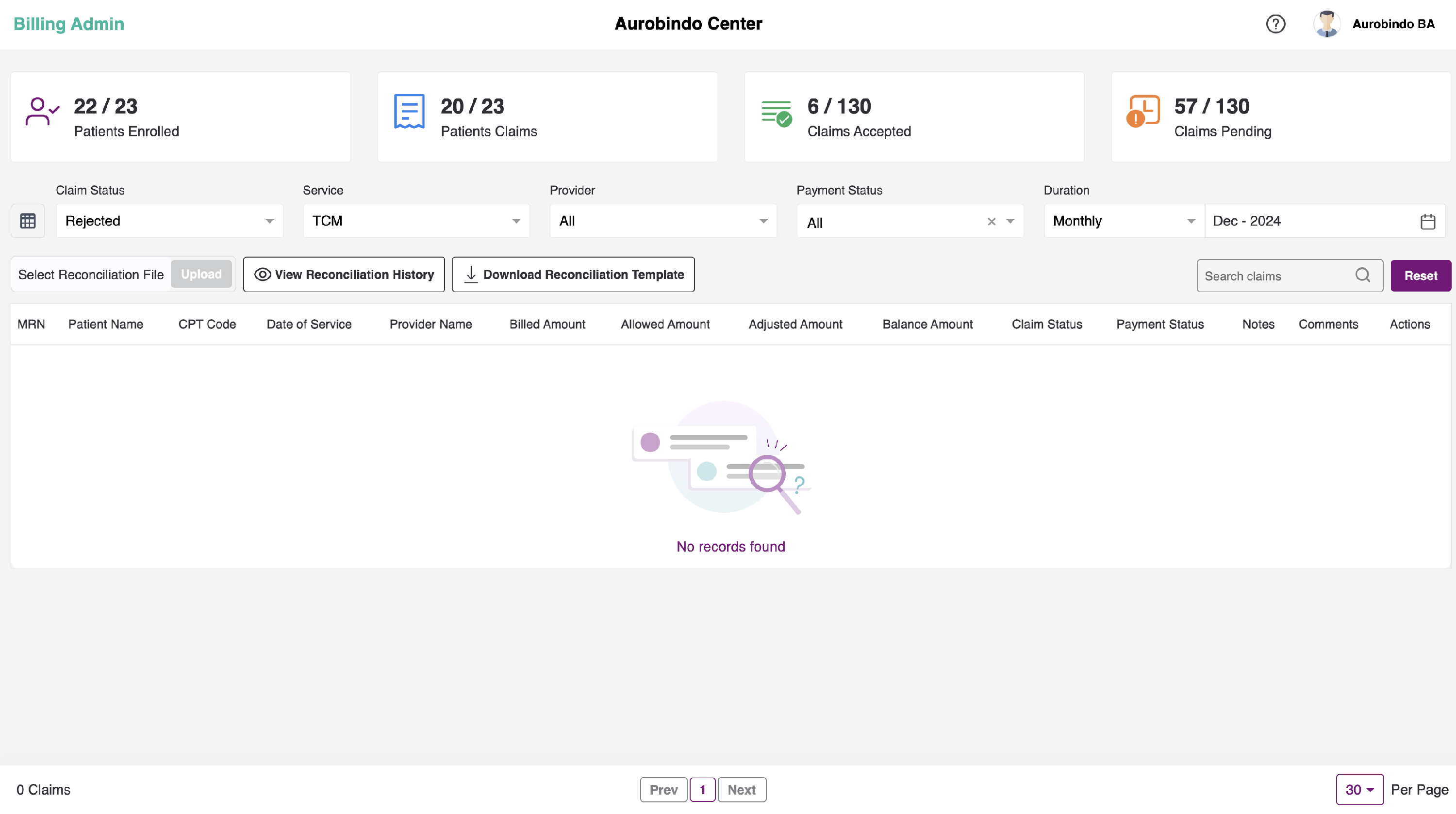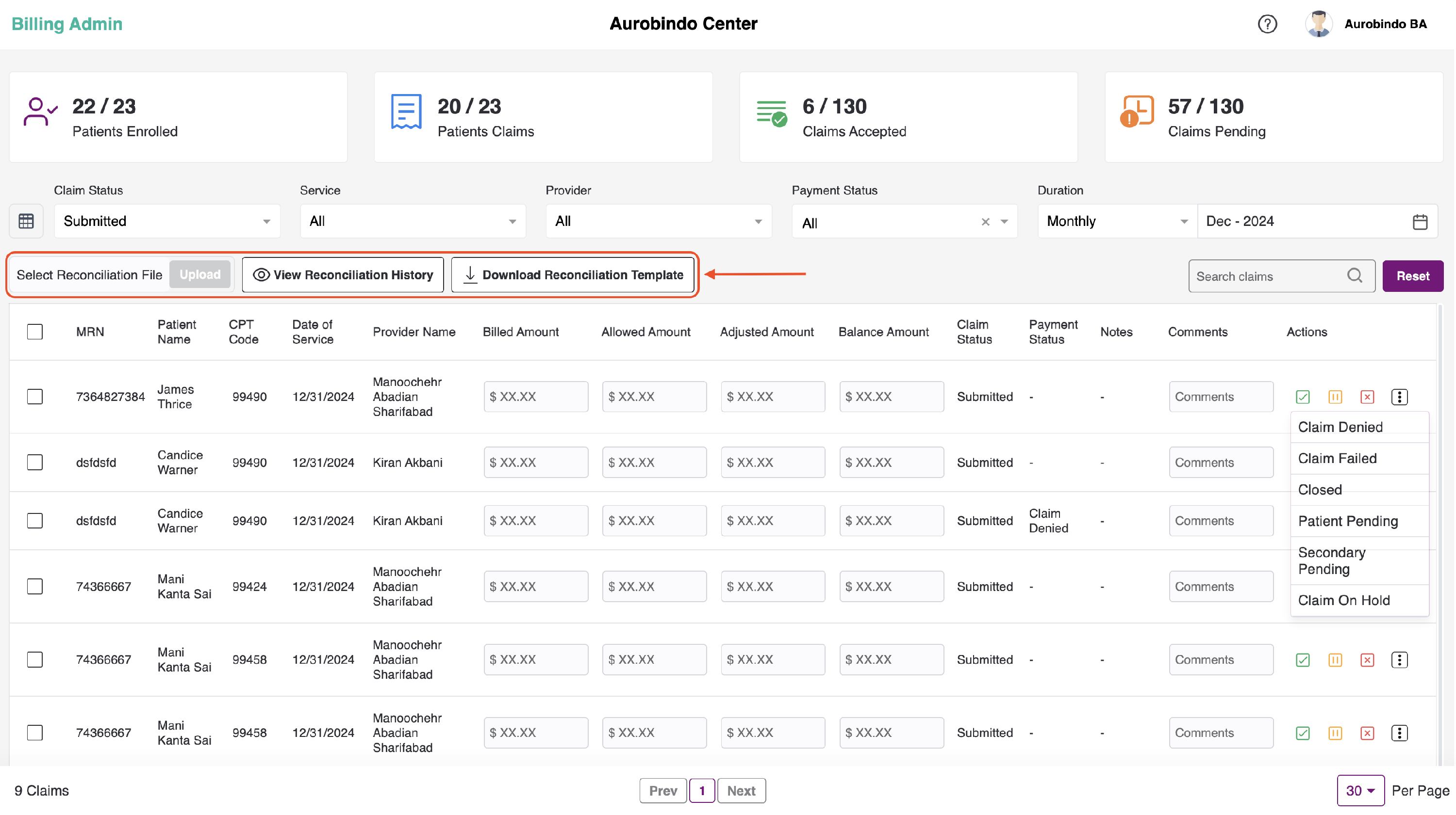 We also have the option to upload the billing reconciliation file. You can upload an Excel file with the claims data of each patient and check the history of the uploaded file. Additionally, you can download a sample file or sample reconciliation template by clicking on the "Download Reconciliation Template" button.