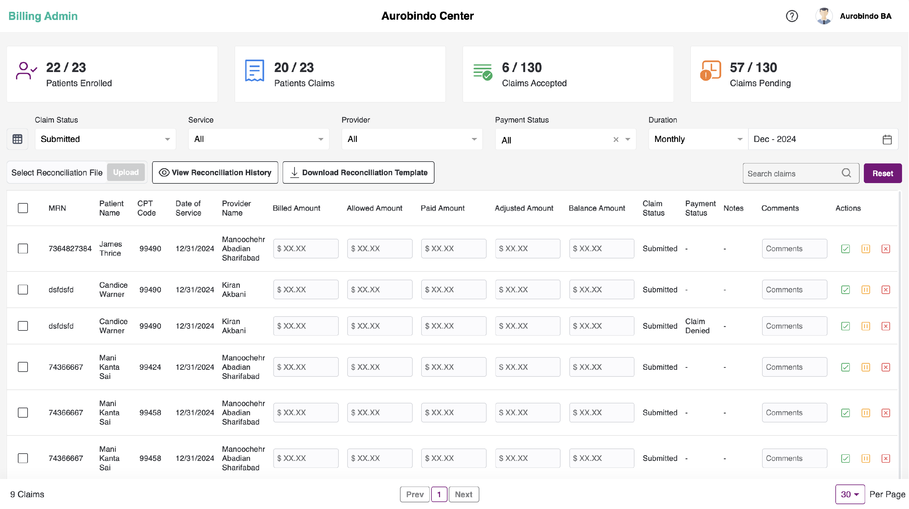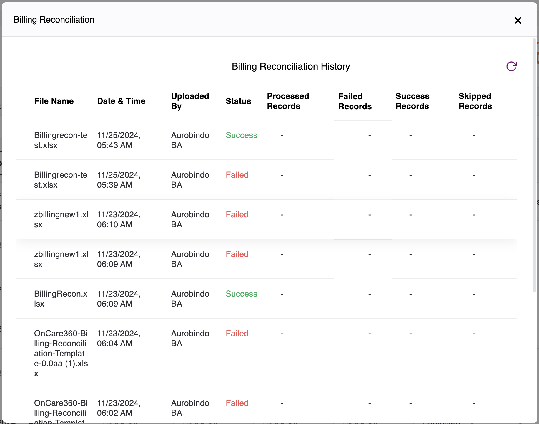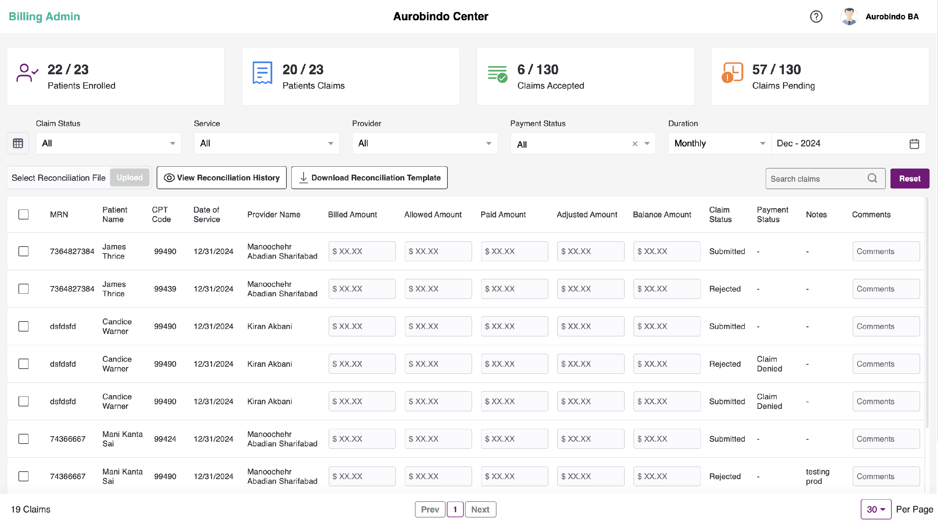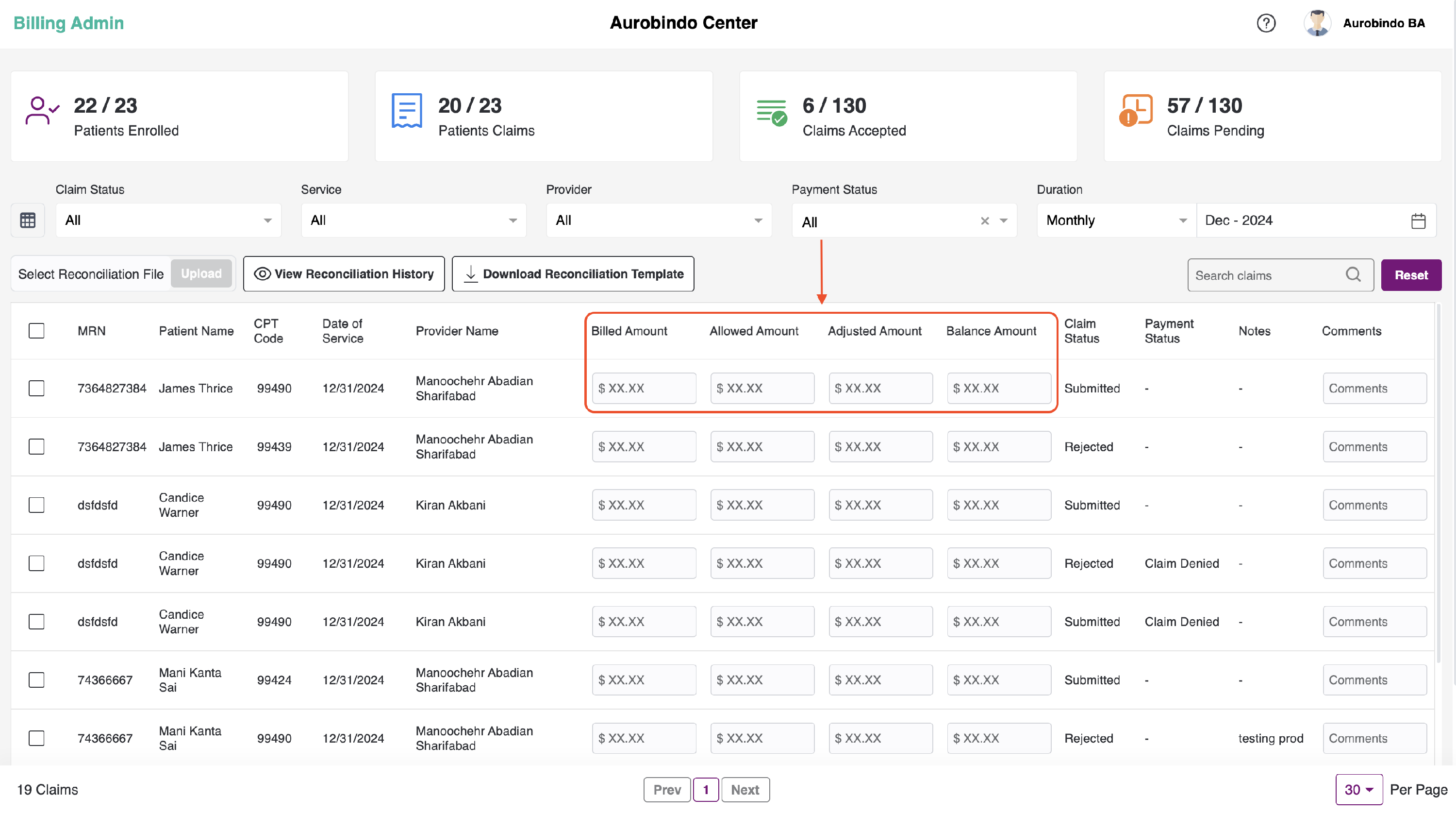 We also have the option to upload the billing reconciliation file. You can upload an Excel file with the claims data of each patient and check the history of the uploaded file. Additionally, you can download a sample file or sample reconciliation template by clicking on the "Download Reconciliation Template" button.