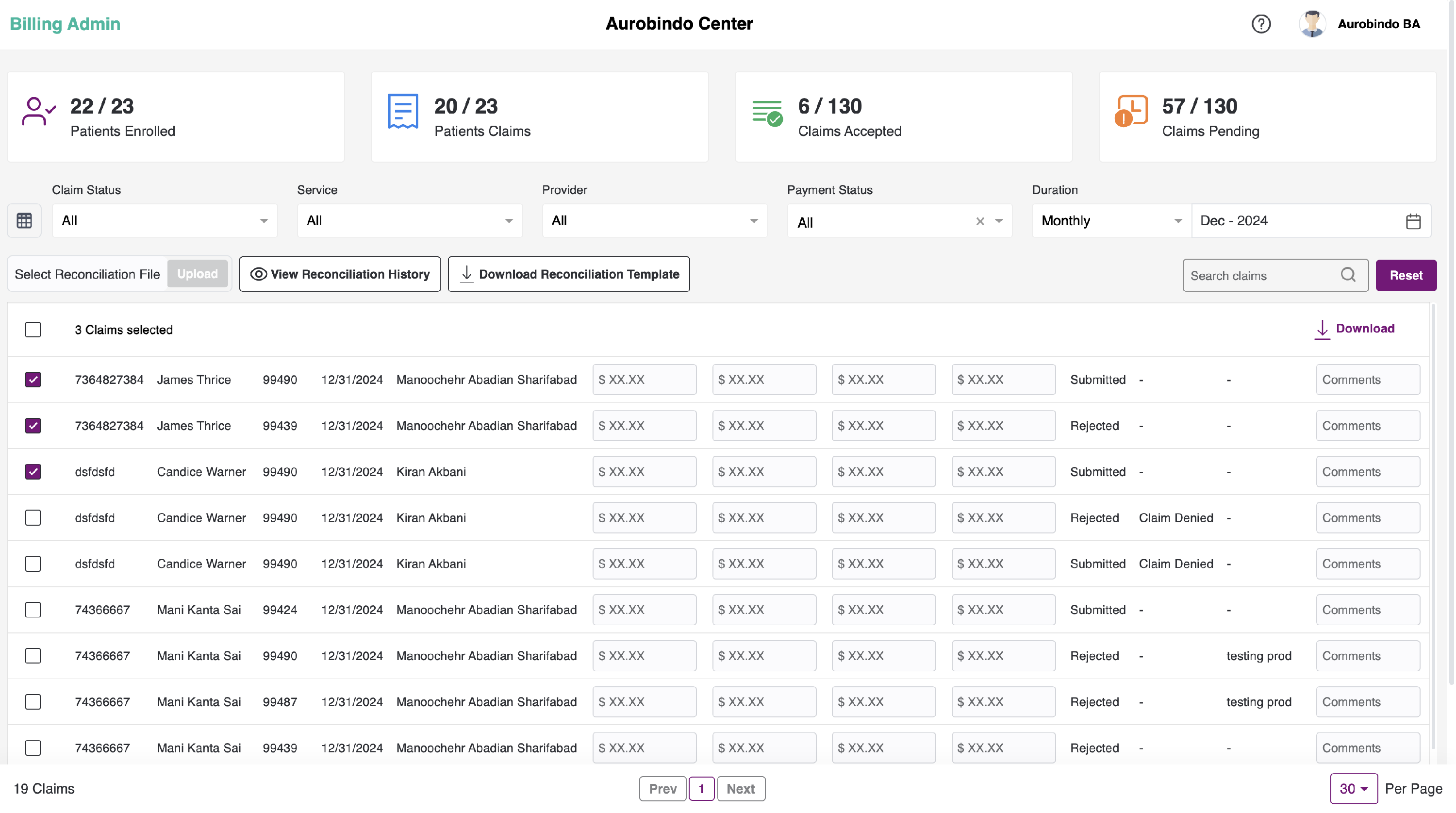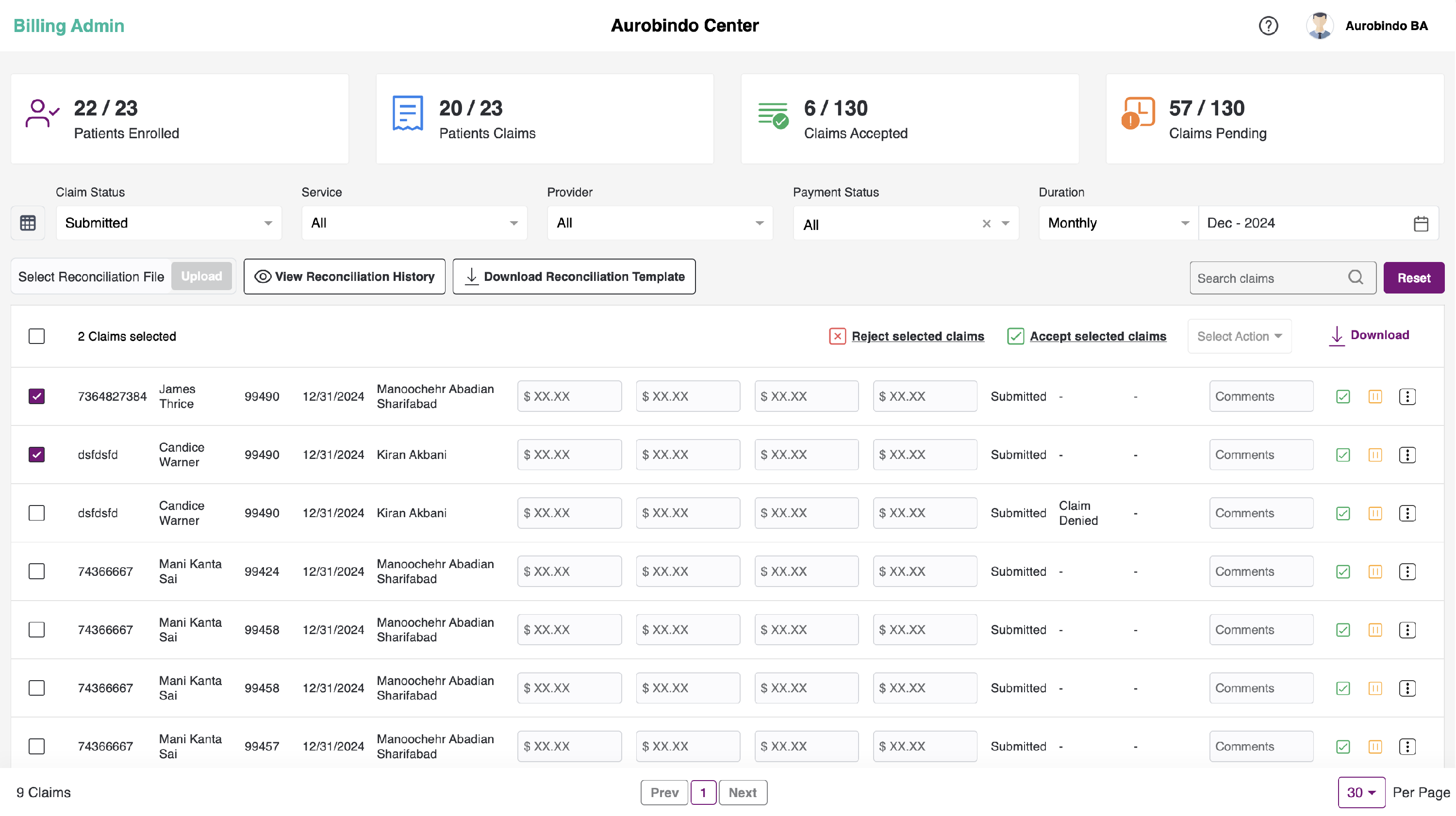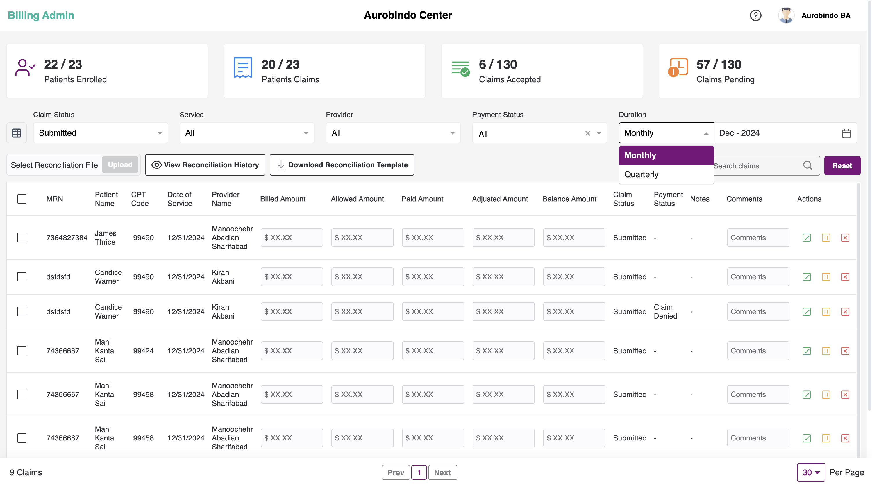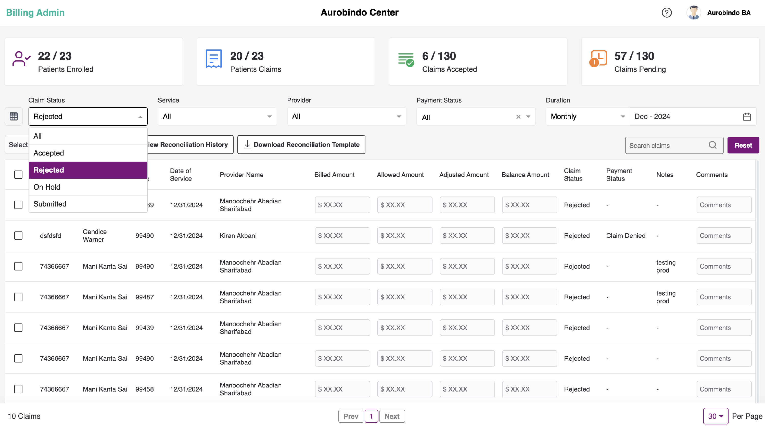 - User can filter the submitted billing list based on the provider name for the specific center.