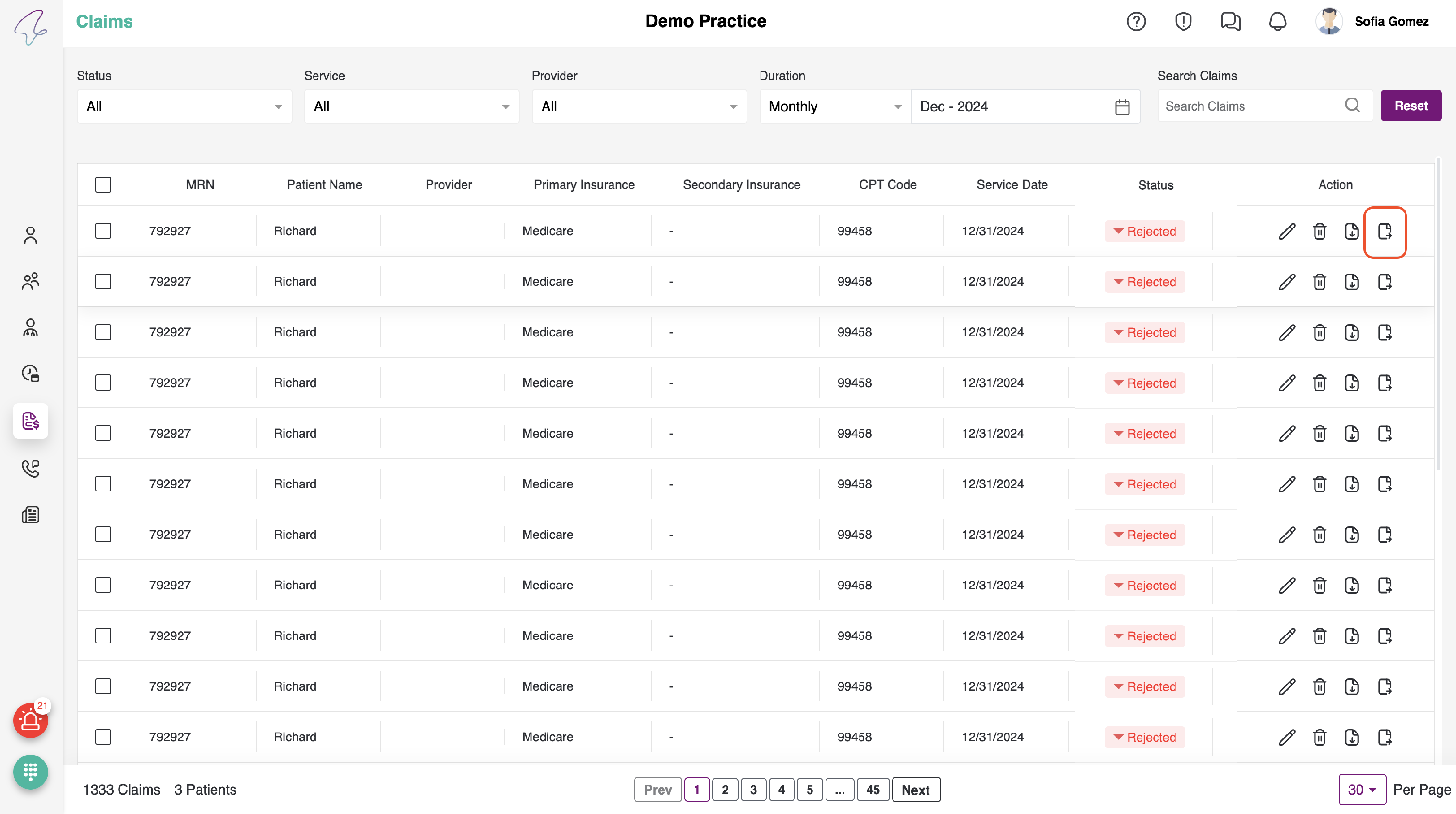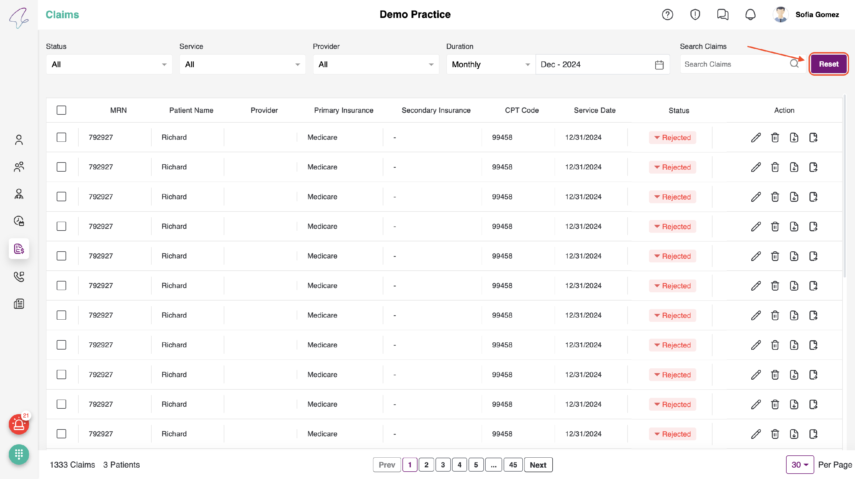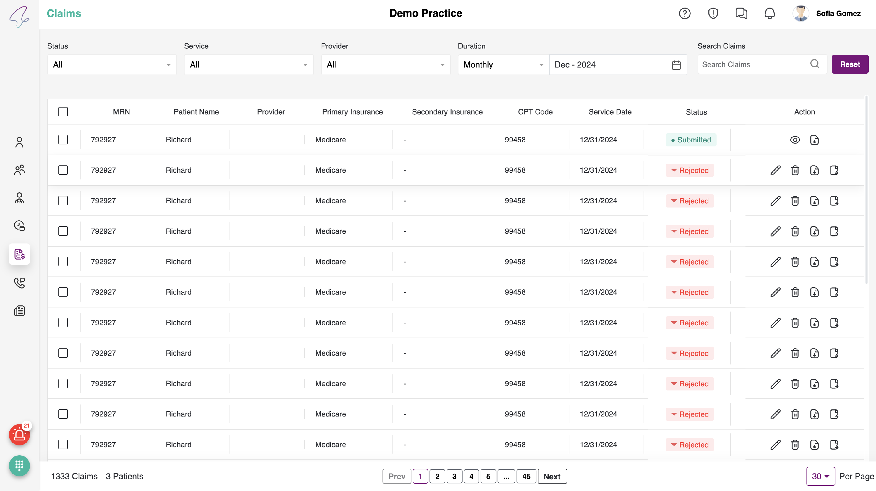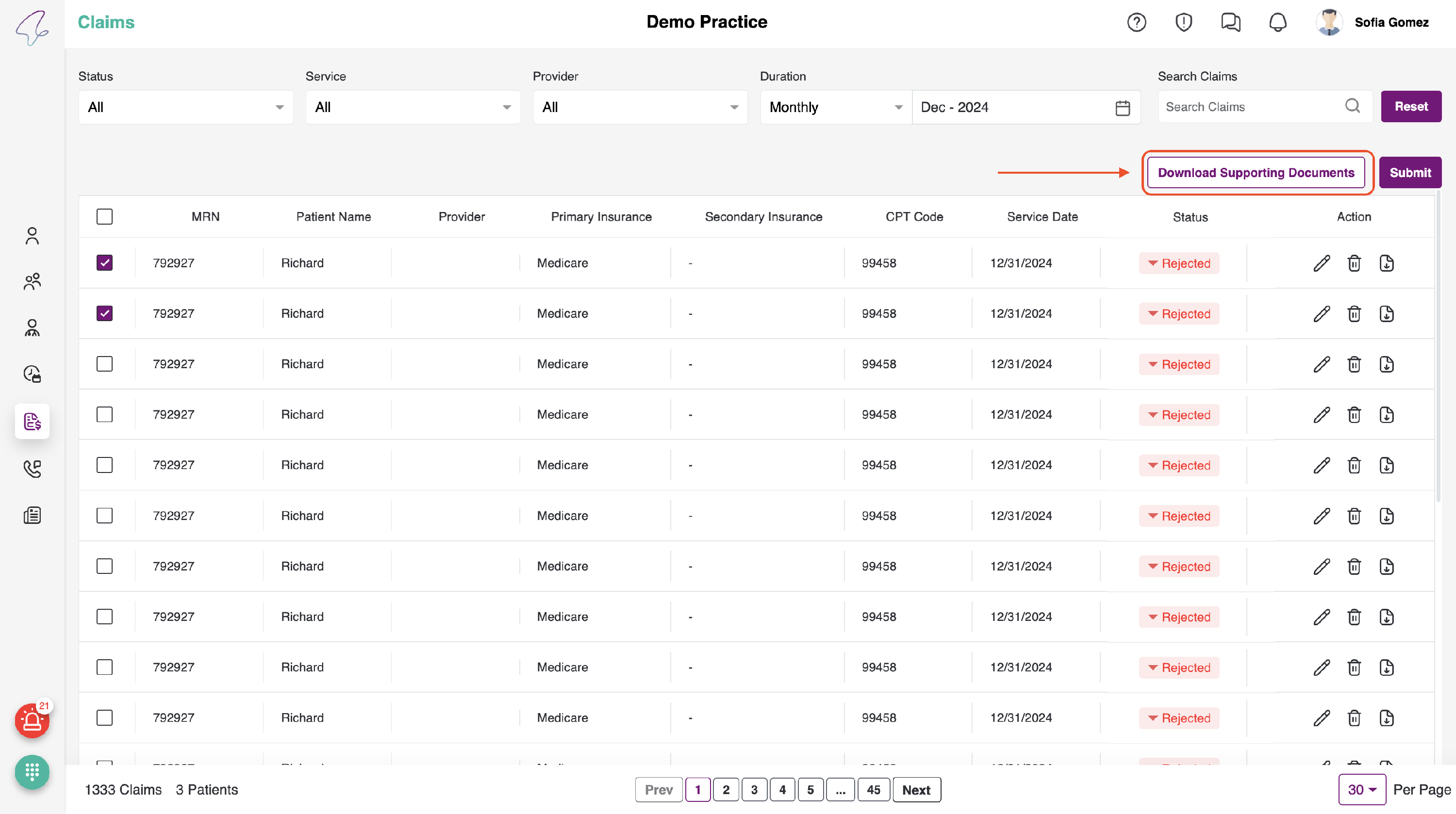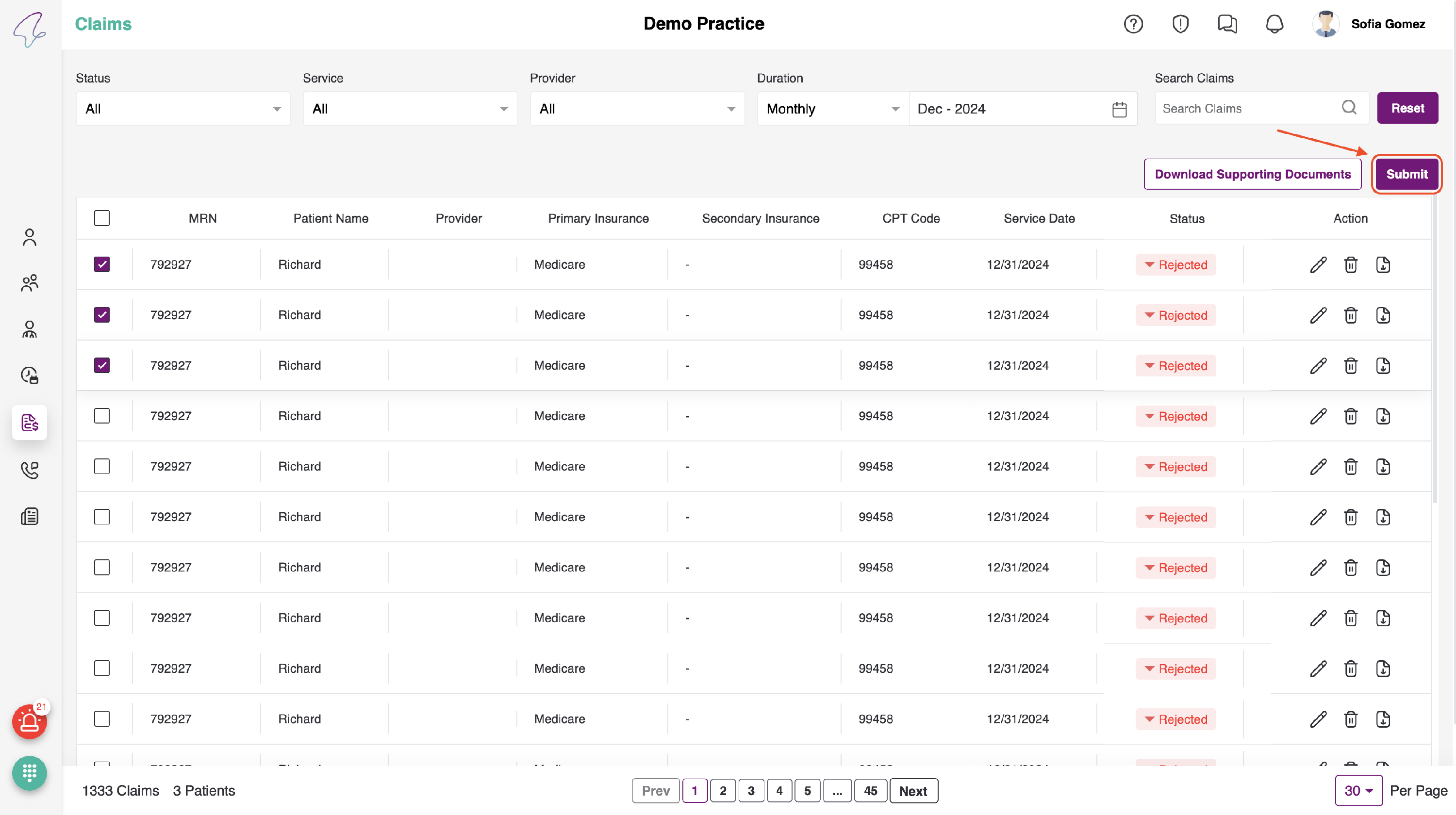 - Here, all of the patient's claims can be viewed and submitted. Additionally, we perform necessary actions such as Edit, Download, Delete, and Submit Claims.