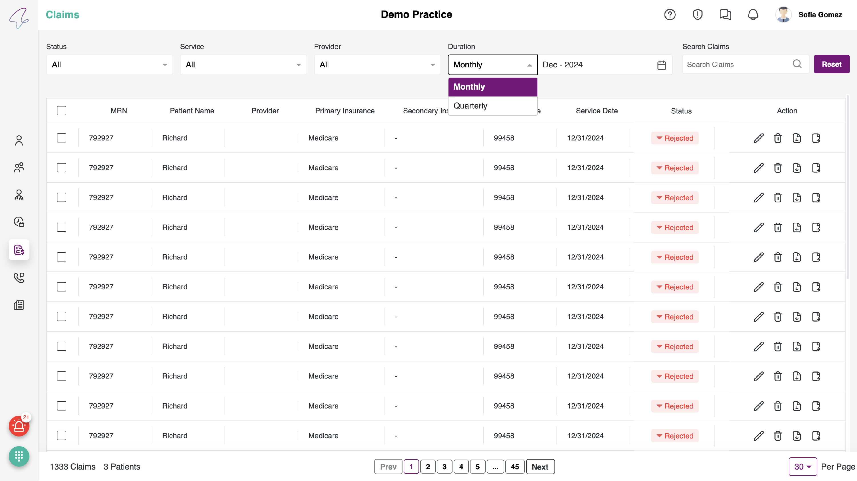- The duration filter offers two options: month and quarter. When selecting the month option, users can view claims on a monthly basis, while the quarter option allows for viewing claims on a quarterly basis.
