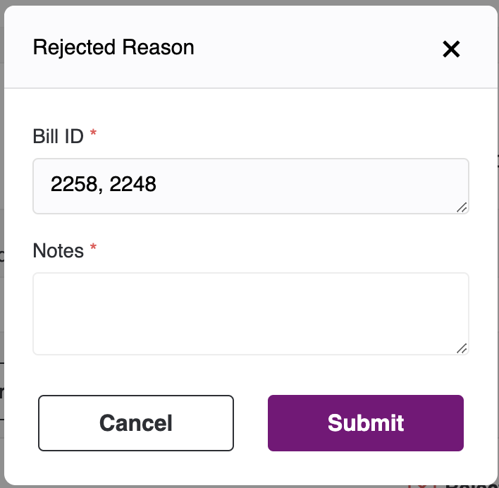 We can also reject bulk bills by selecting the records and clicking on the "Reject selected claims" button, which will be visible in the headers once you select the bills. Upon clicking the button, a pop-up will appear where you have to enter the reason for rejecting the bills and click submit. The bills will then be seen under rejected bills.