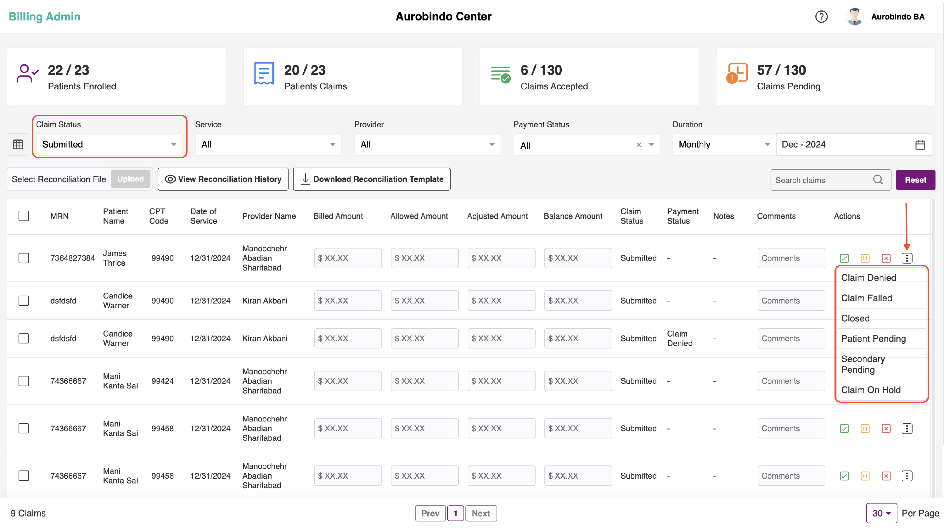 We also have the options of Claim Denied, Claim Failed, Closed, Patient Pending, Secondary Pending, and Claims On Hold to change the payment status of each claim. To access these options, select the submitted claim status and click on the more icon as shown in the below image.