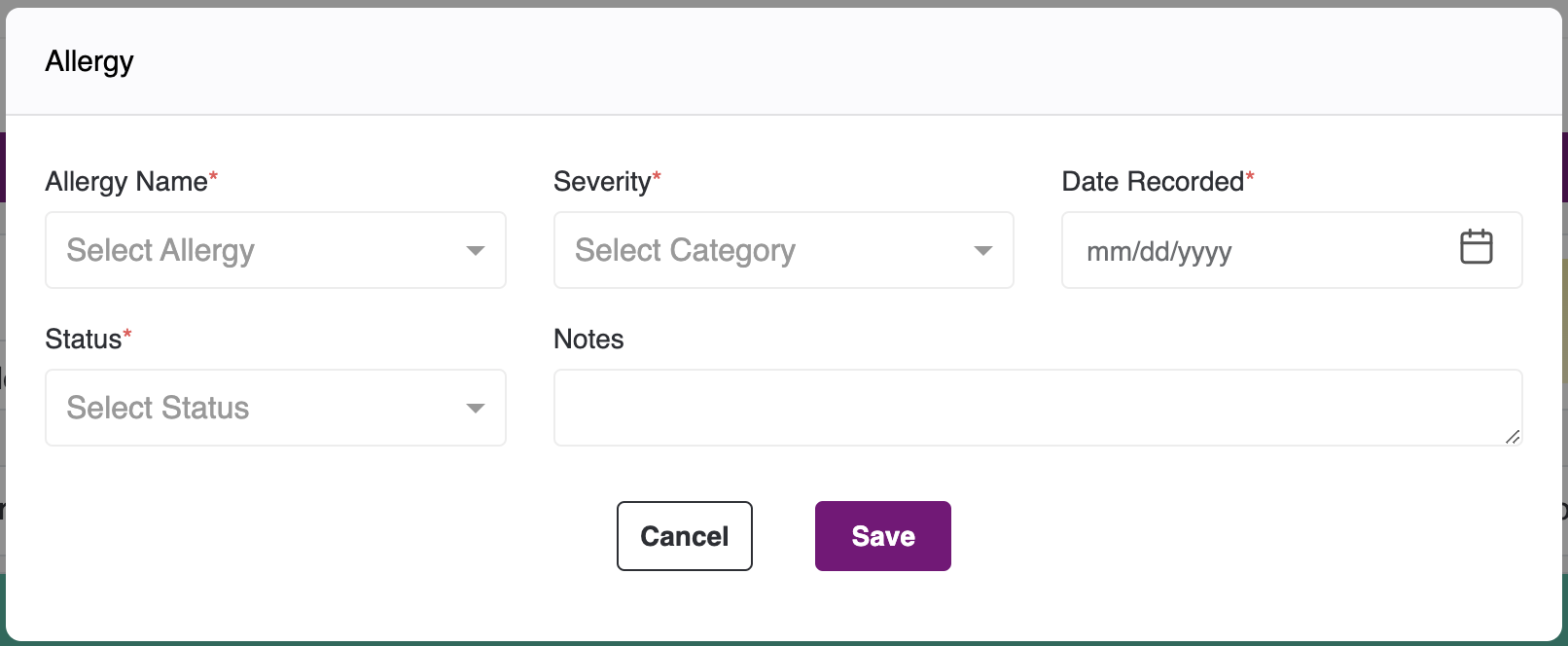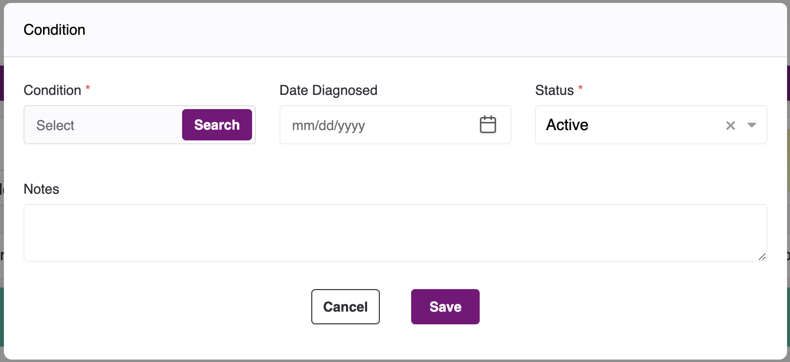 - In the Diagnosis section, we have fields - Chronic conditions, Allergy. To add data, you can see an add button beside their labels. On clicking the button, respective pop-up appears.