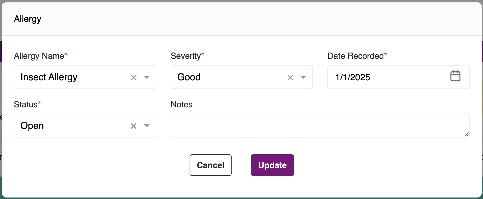 - Similarly, to make any changes in Allergies, click on the Edit icon and Update button to save the changes.