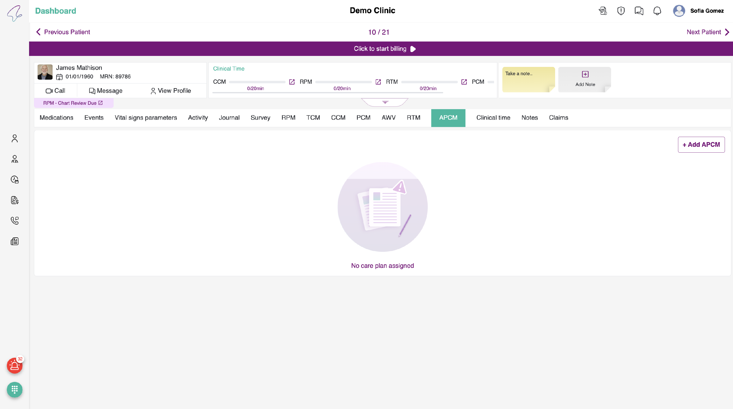 If you have clicked on the APCM service and then clicked on Yes to bill the time, it will navigate you to the service with the billing timer ON. This action will disable other services because when you are billing for a particular service, you can't navigate to other services such as PCM, TCM, RPM, or AWV.