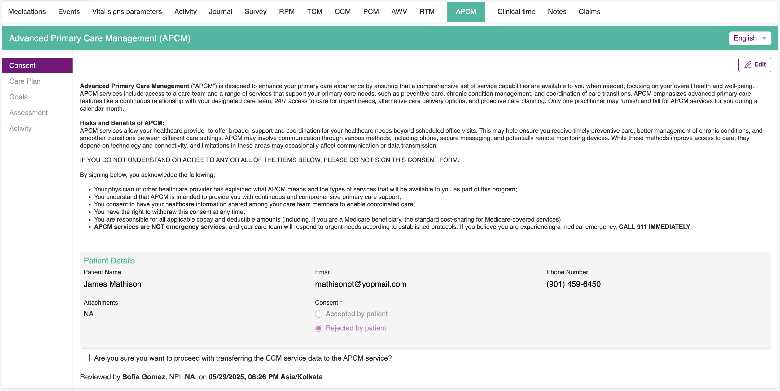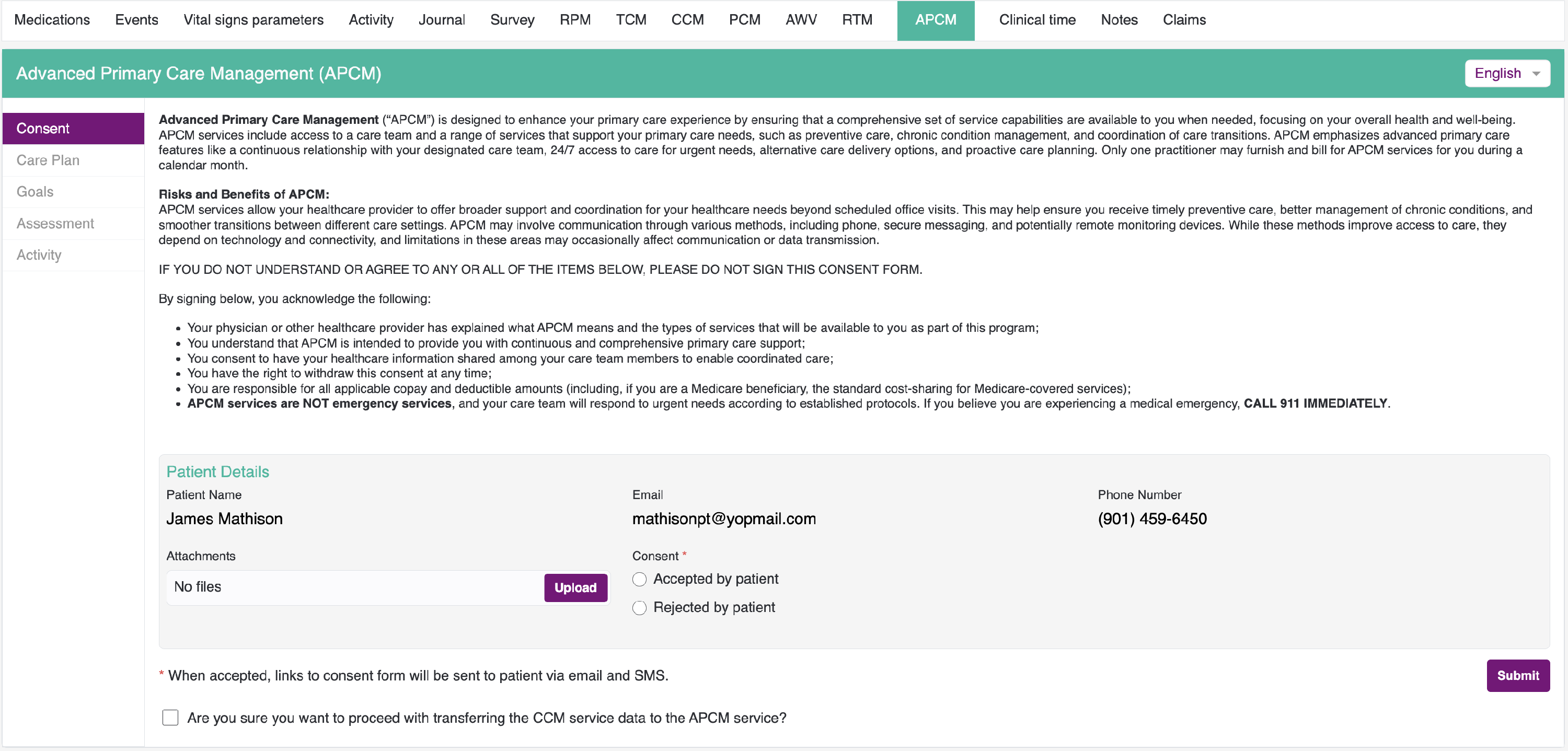 - If the patient agrees to take APCM service, click on "Accepted by patient". If the "Migrate CCM care plan" checkbox is visible, then choose the best way that suits your process and click submit.