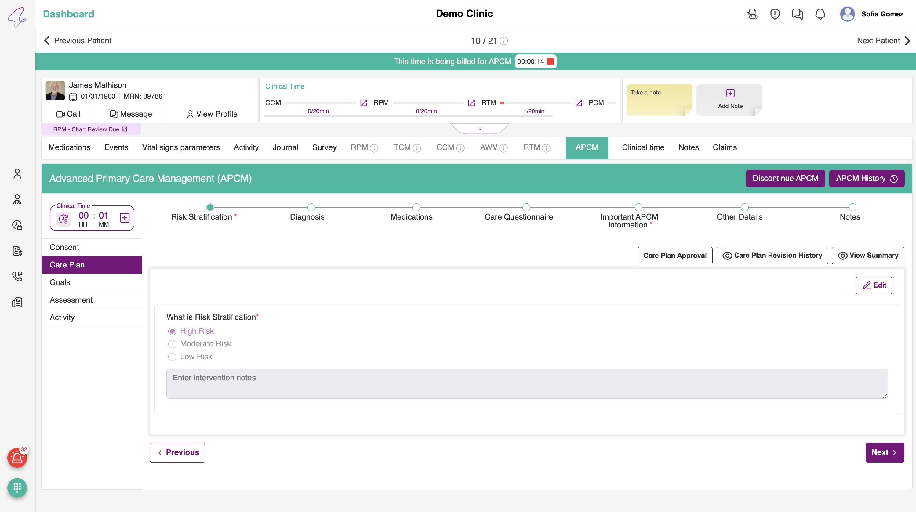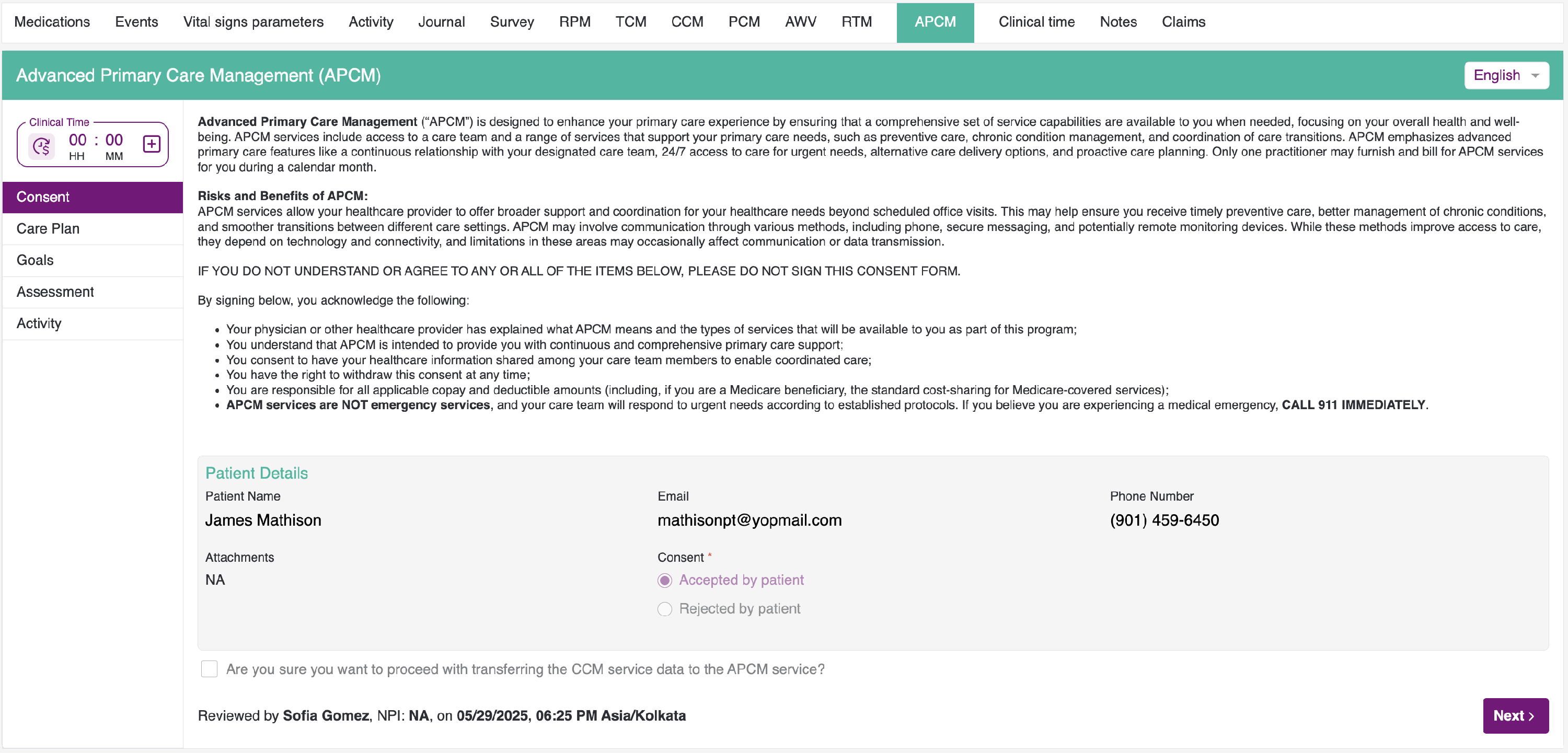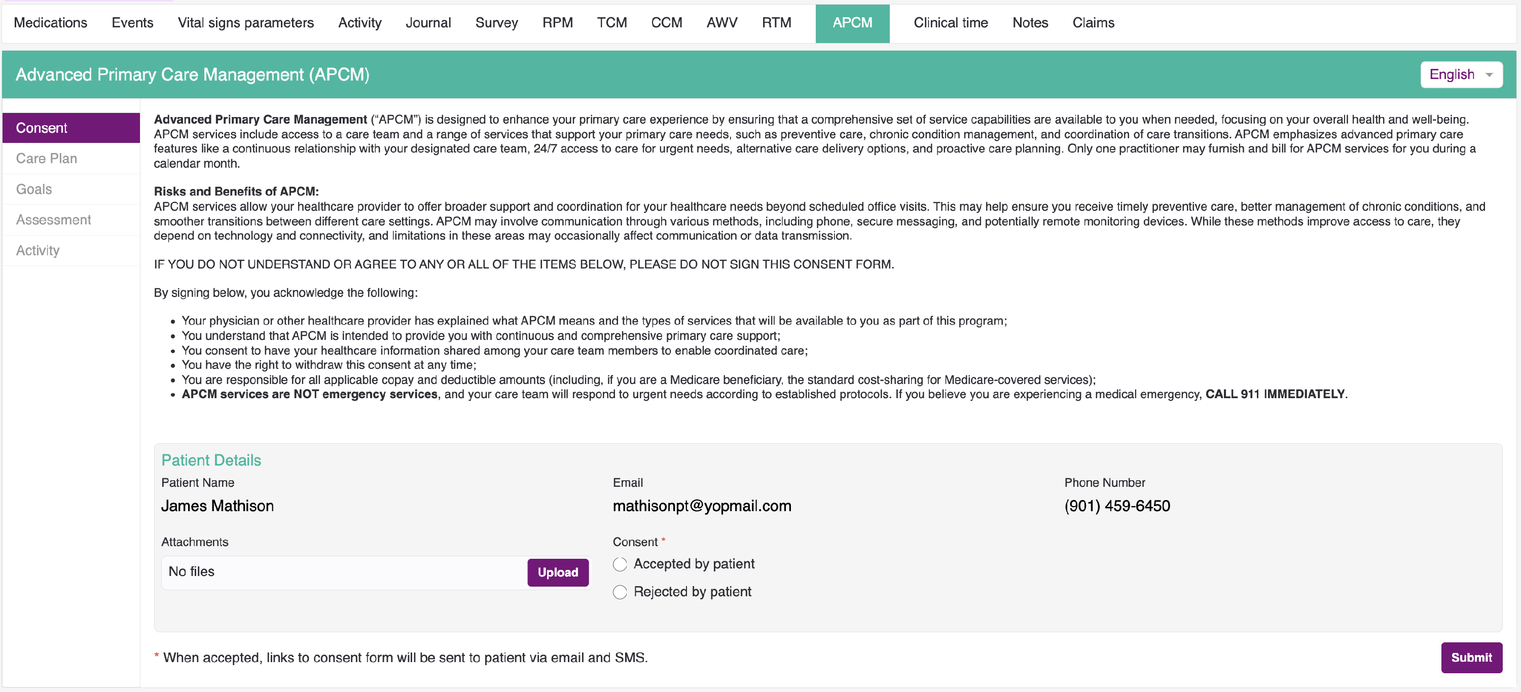 - To add APCM, go to Patient Dashboard. Click on APCM tab. Click on "Add Care Plan" Button. Consent screen appears.