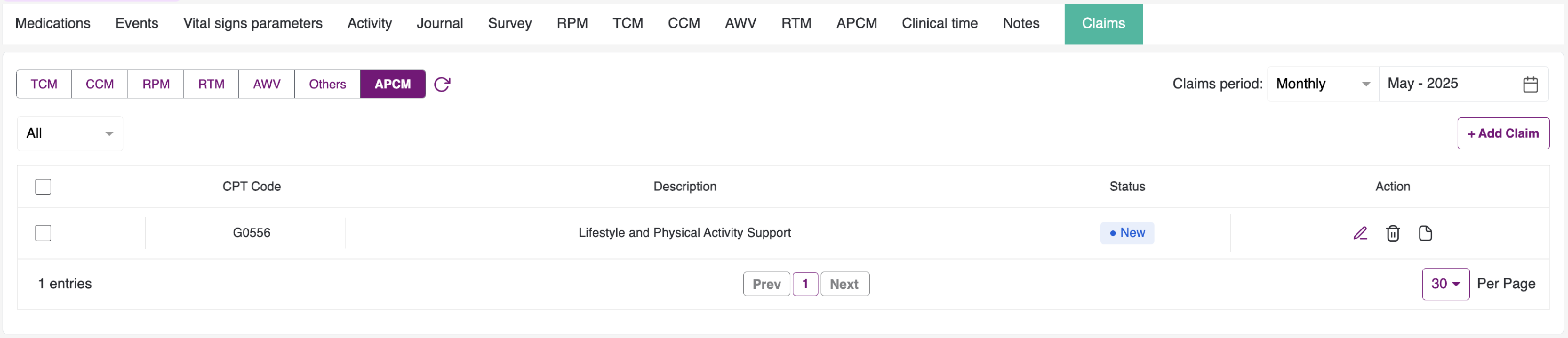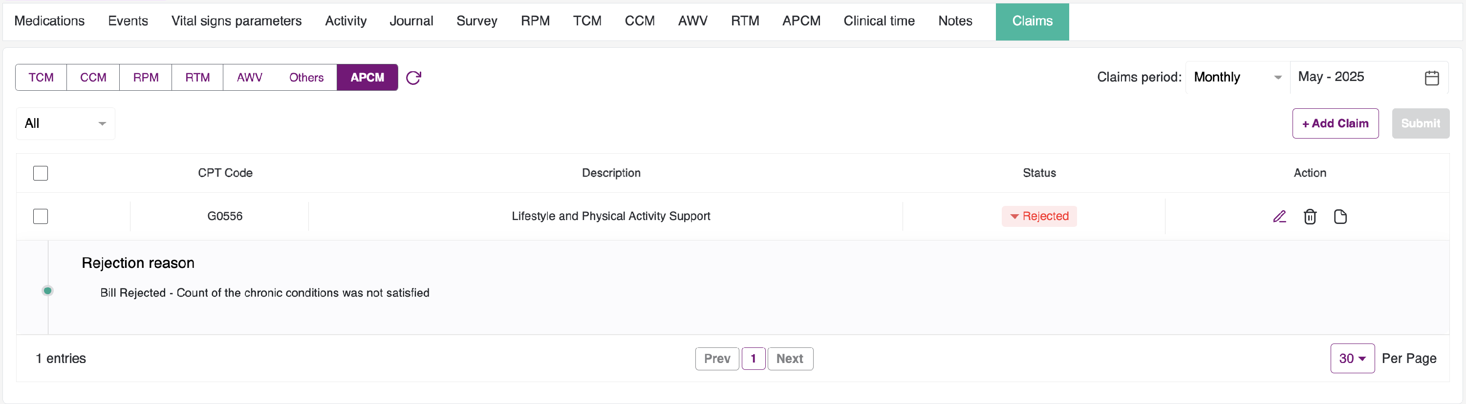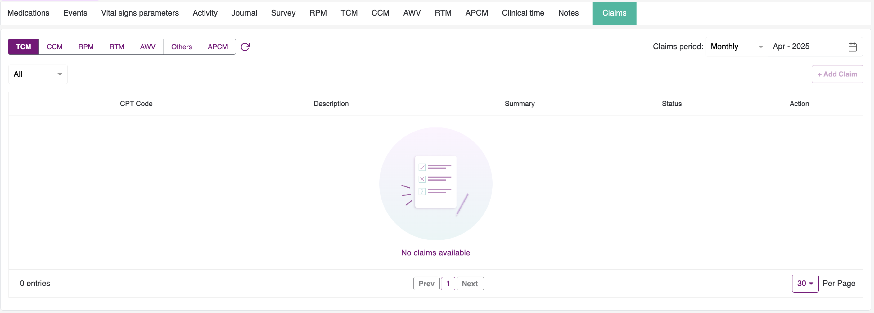 - To view the Clinical Time Logging (Billing) for APCM, go to the Patient Dashboard and click on the Claims Tab. Following screen can be viewed.