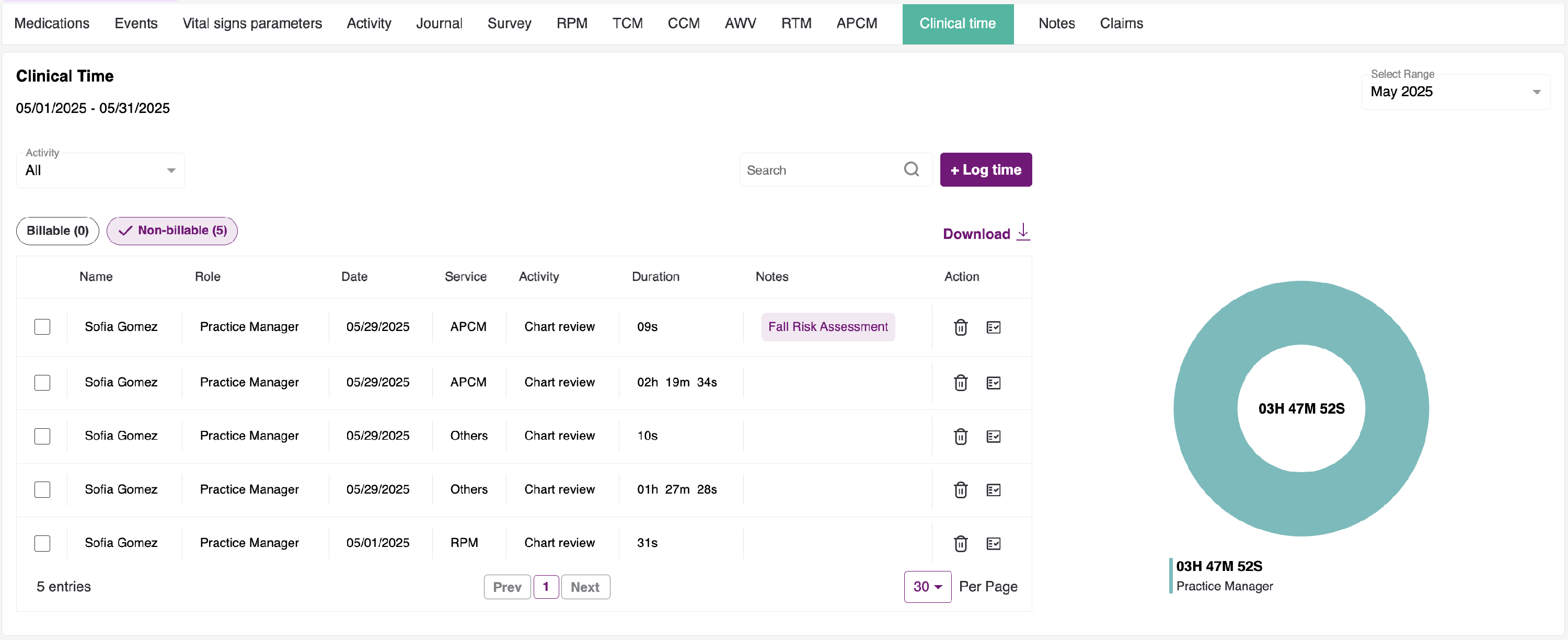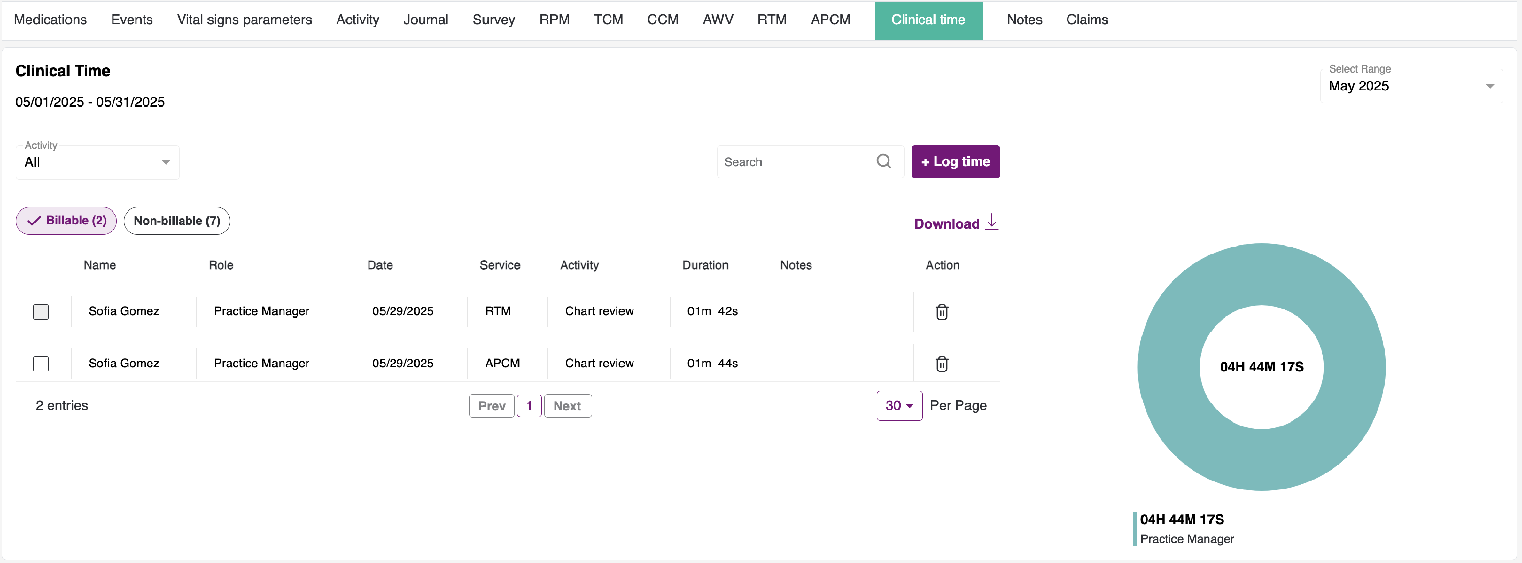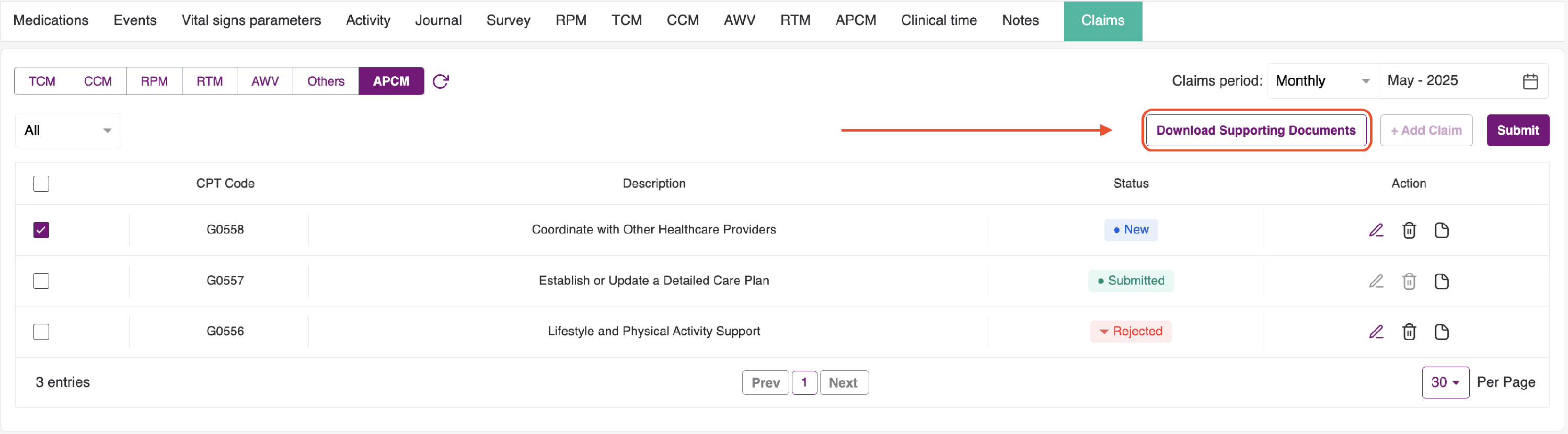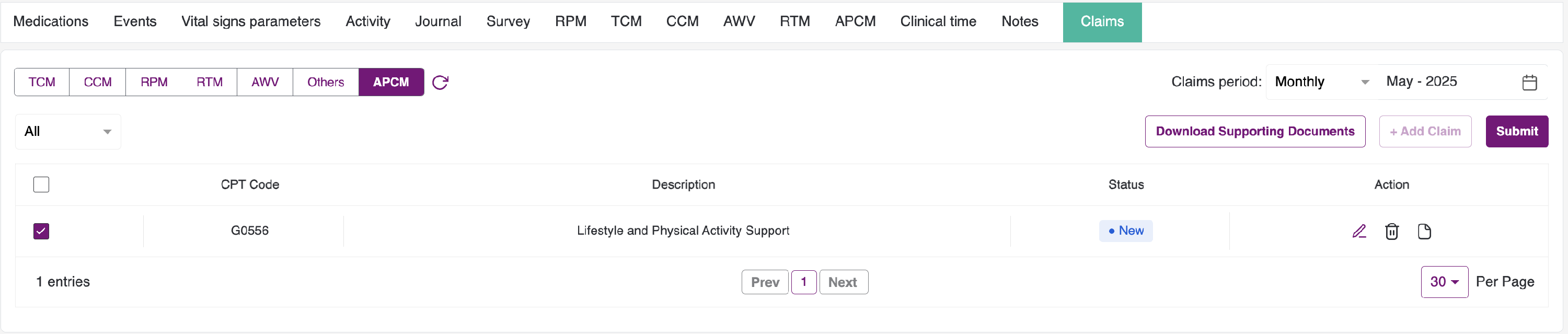 - To view the Clinical Time Logging (Billing) for APCM, go to the Patient Dashboard and click on the Claims Tab. Following screen can be viewed.