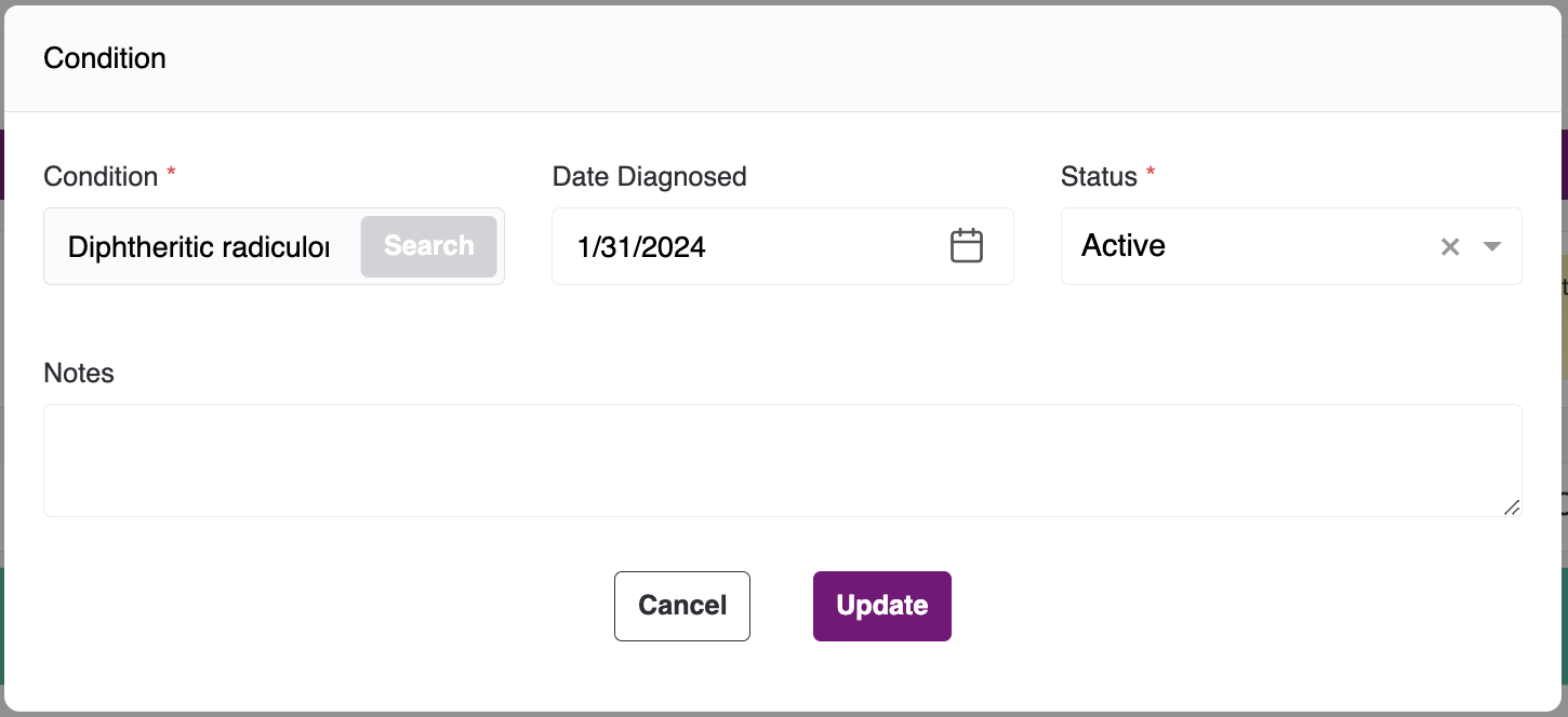 - To edit Diagnosis list, hover over the fields, you can see an Edit icon, shown as follows. Once you make the changes, click on the Update button to save the changes. Else click on Cancel button to discard the changes.
