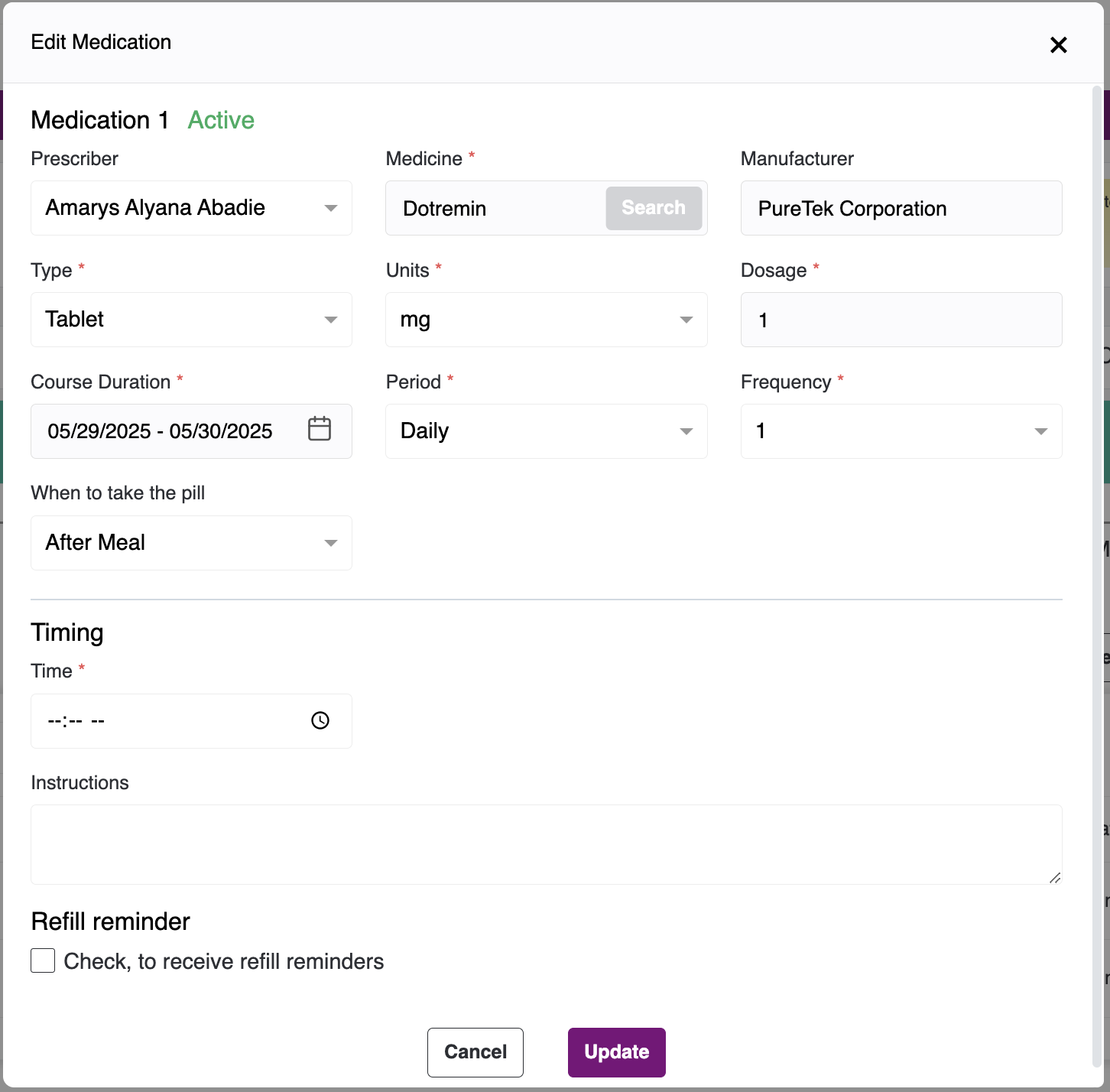 - You can see thee list of Active Medications prescribed for the patient. You can add, edit, activate & inactivate, and delete medicines.