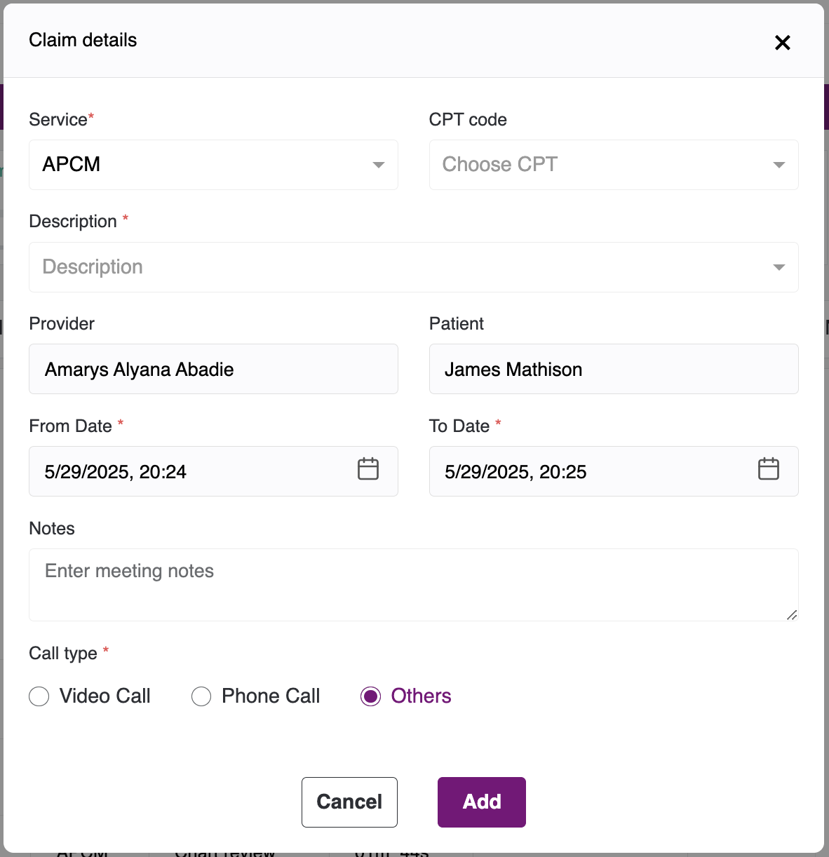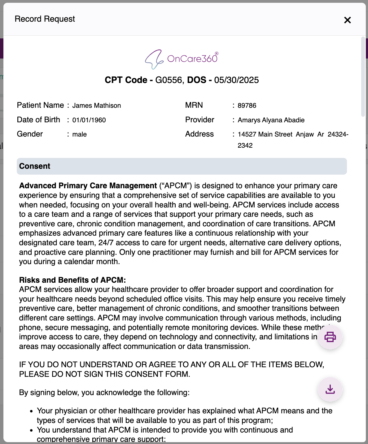 As shown in the above image, when you click on any service APCM in the patient listing, it will show you the pop-up as follows.