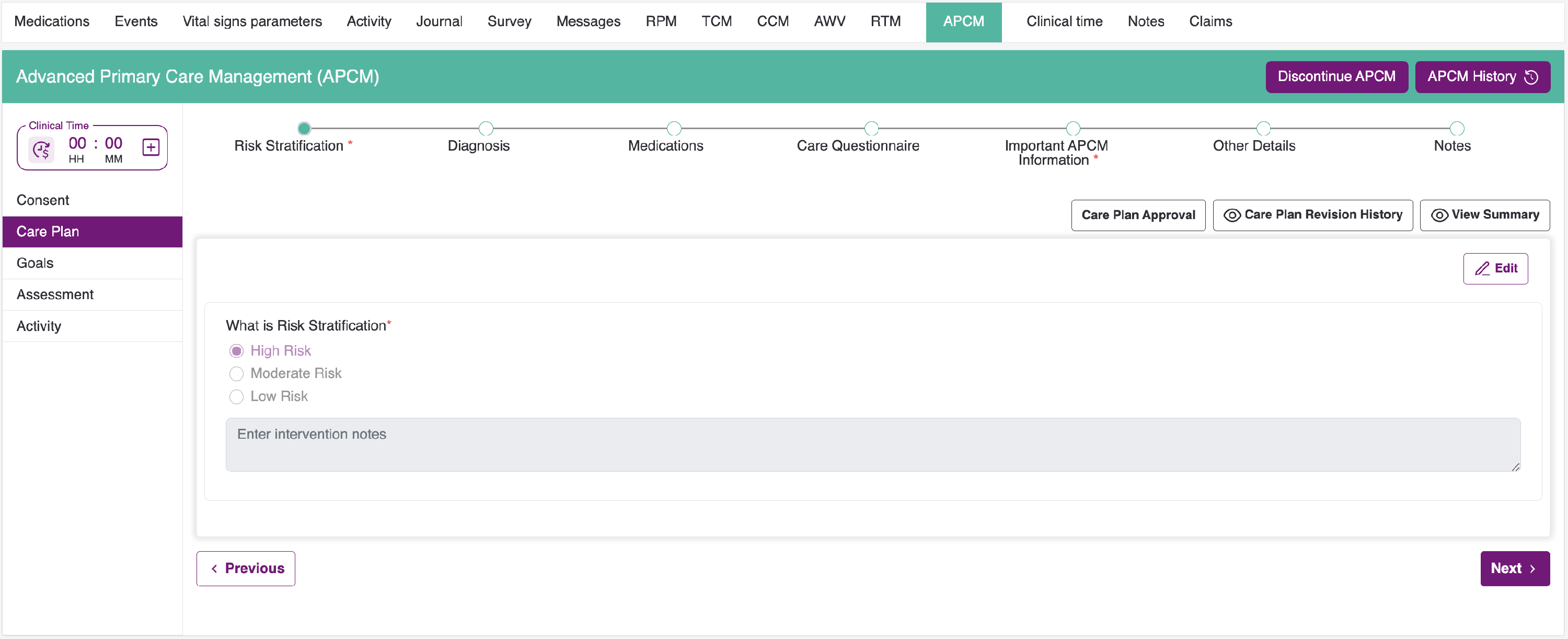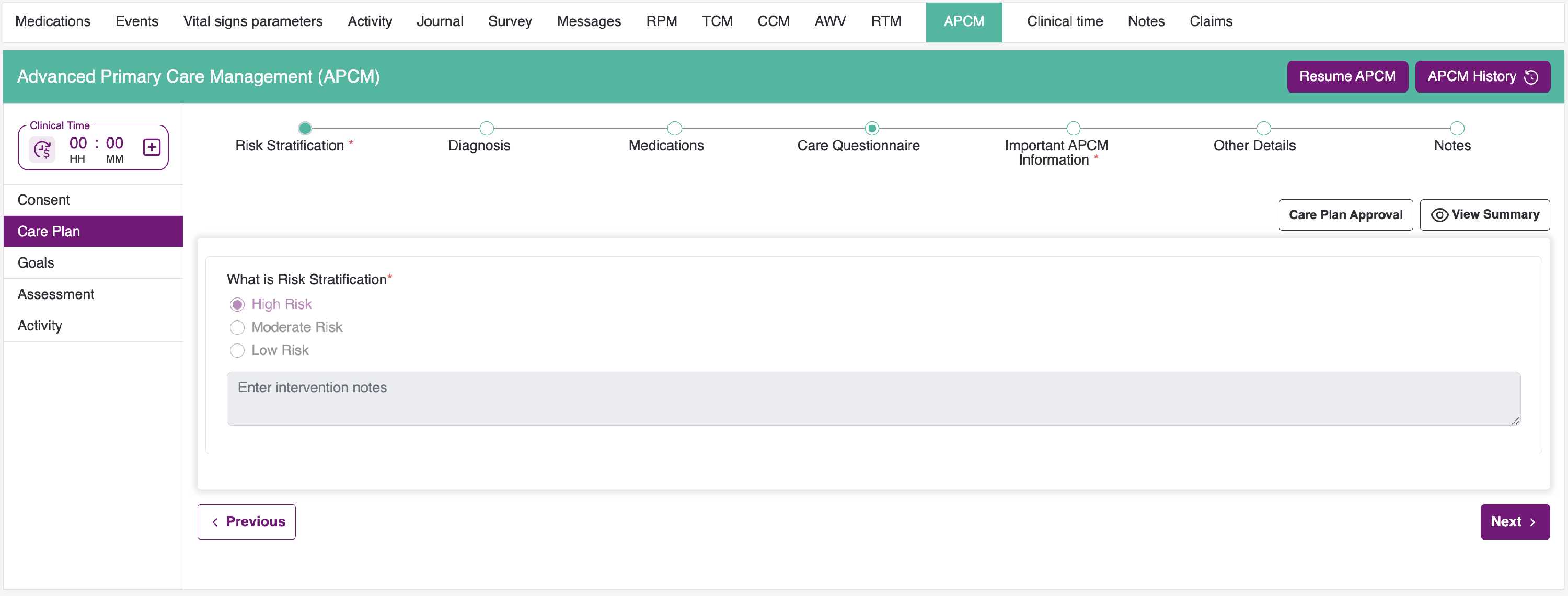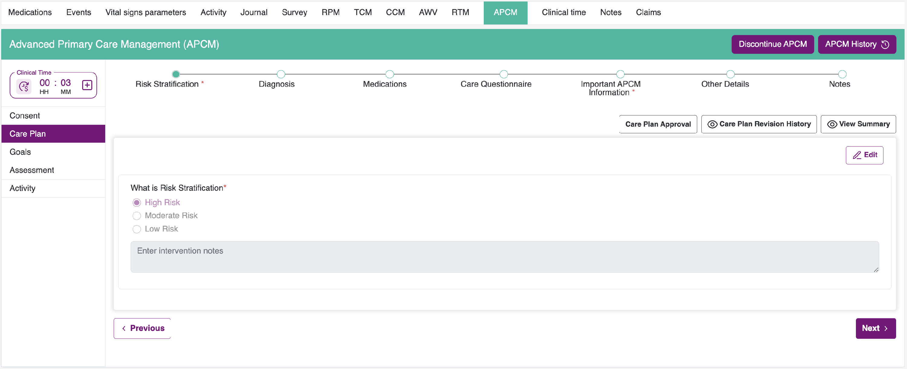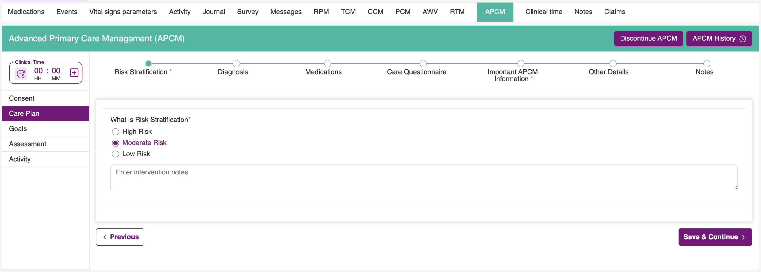 - In the first section, we have Risk Stratification. This is a mandatory section, and we need to select any one option. Upon selecting the option, we will see an intervention text box below the option, which is not mandatory.