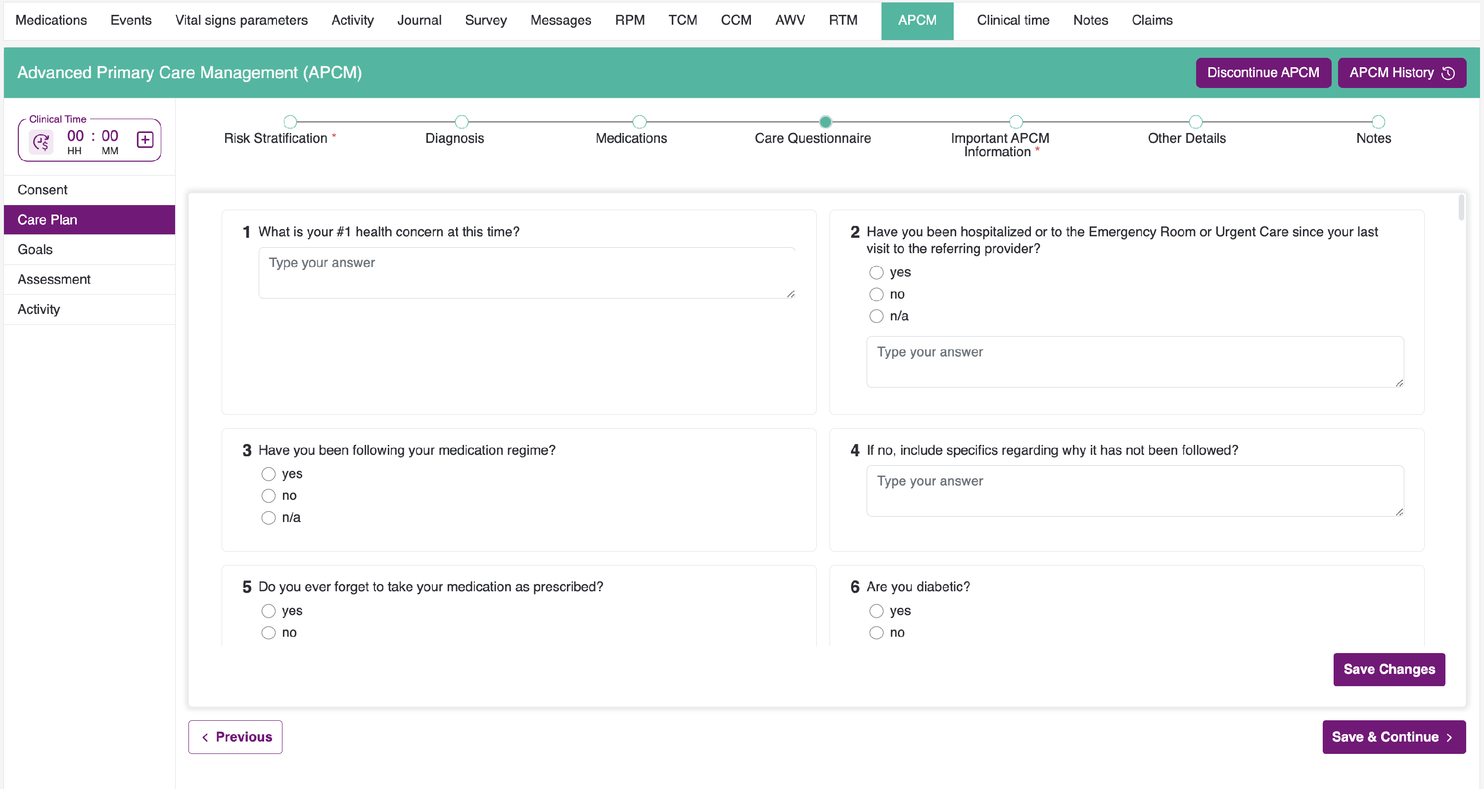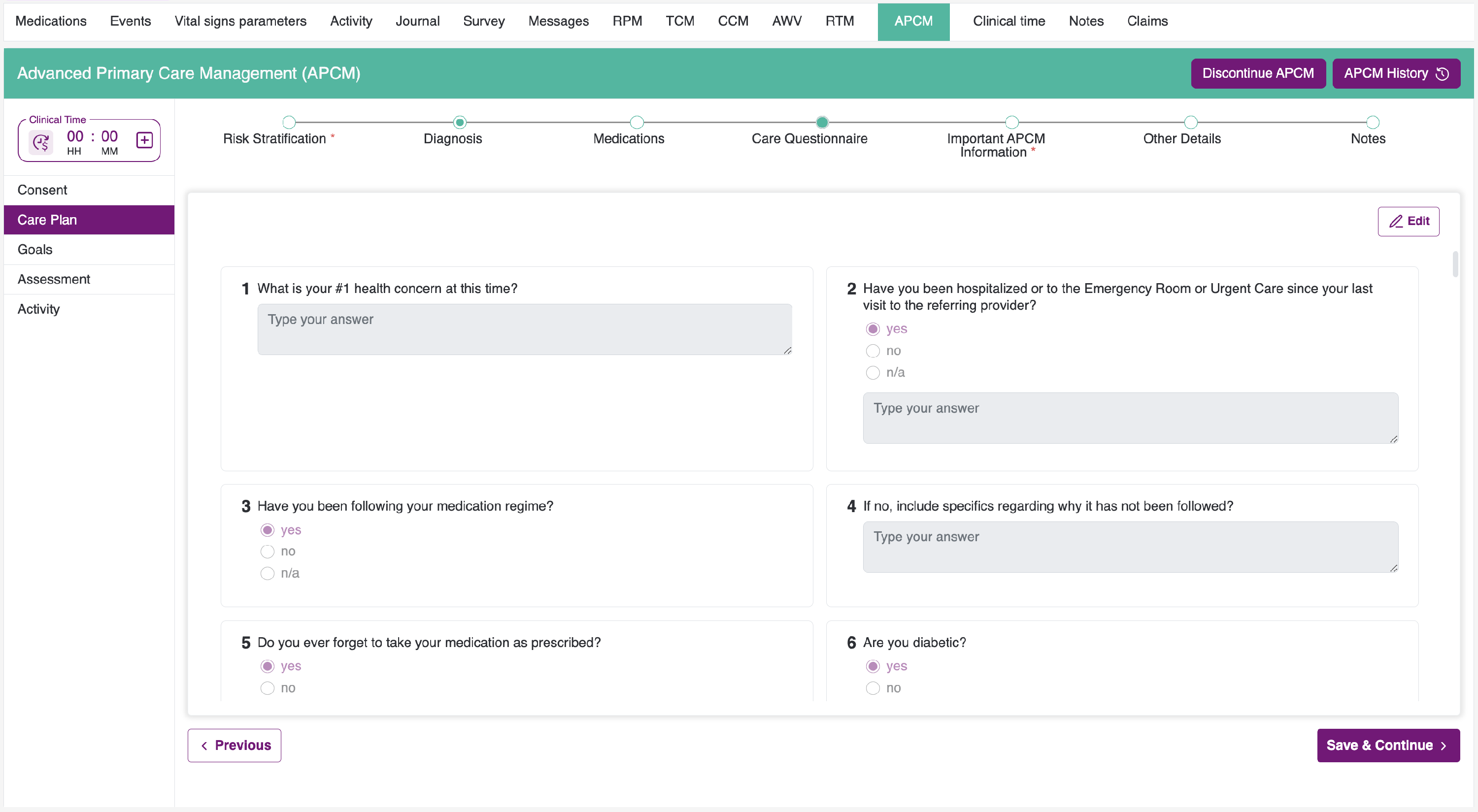 - After answering all the required questions in the care questionnaire, click on the "Save & Continue" button. The "Important APCM Information" section will appear.