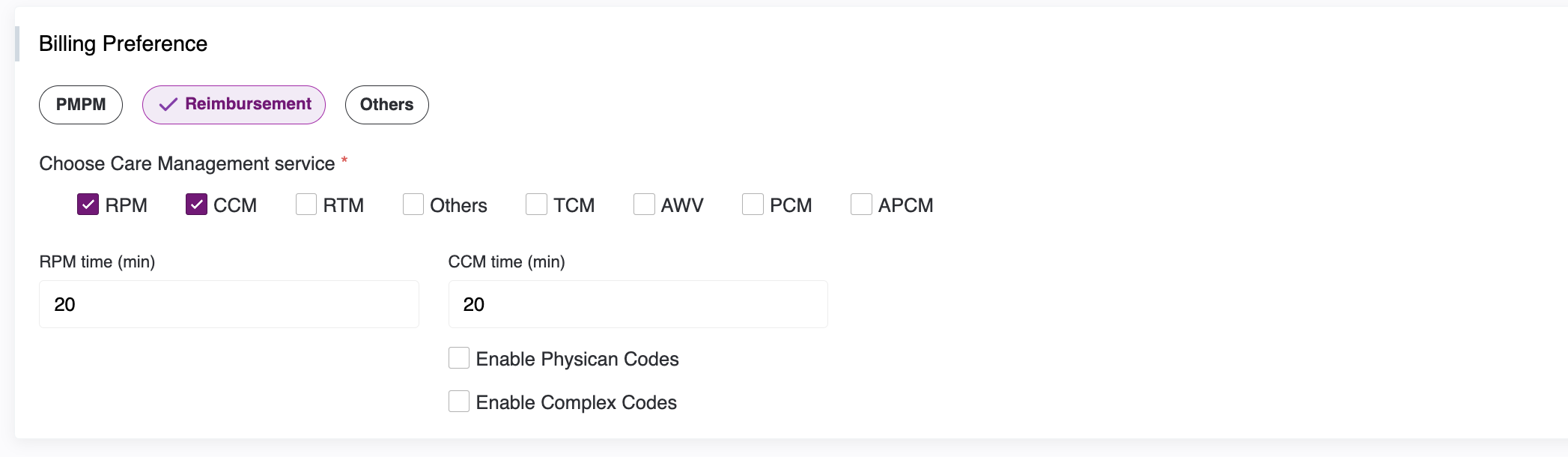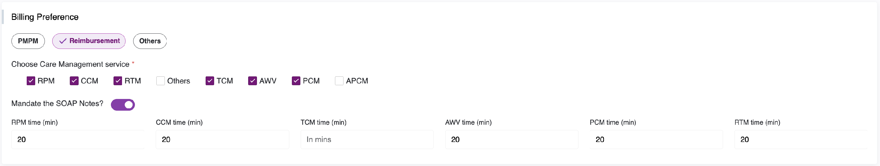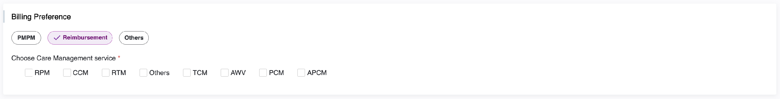 | Reimbursement | Enable individual services like RPM, CCM, etc. |