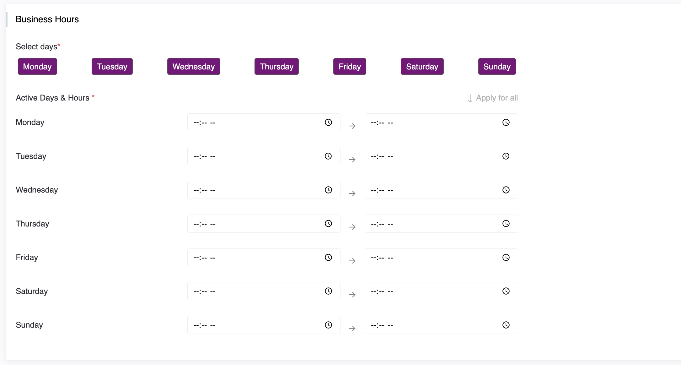 - Once you fill in any of the selected days, you have an apply all option by clicking on that text you which timing will apply the timing to all the selected dates